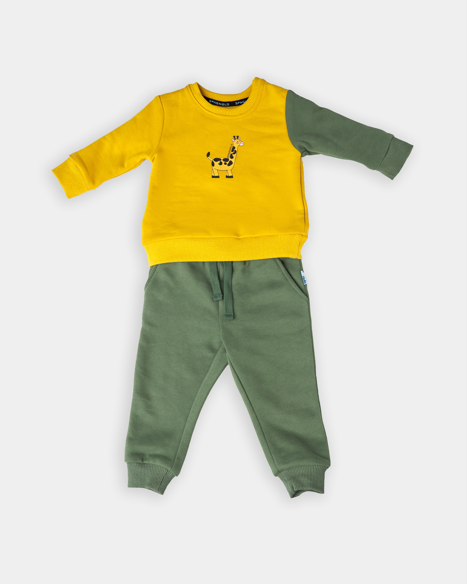 Este set es ideal para un estilo divertido y lleno de color, garantizando máxima comodidad y calidez para el juego diario.La sudadera de felpa es de diseño bicolor en amarillo mostaza y verde oliva, con un divertido estampado de jirafa. El pantalón de felpa a juego en color verde oliva tiene un ajuste cómodo con cintura y puños elásticos.Ambas prendas son de tejido suave, perfectas para asegurar l