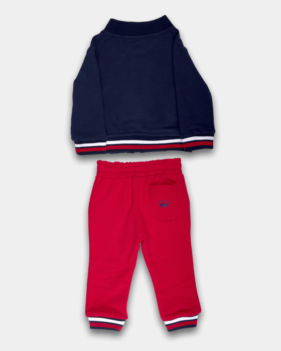 Este set es perfecto para un estilo deportivo y lleno de energía, garantizando máxima comodidad y calidez para el juego.Ambas piezas están confeccionadas en suave punto felpa 100% Algodón, un tejido ideal para el confort diario. La chaqueta con cremallera en azul marino lleva un cuello y puños elásticos con rayas decorativas y un detalle de 'S' universitaria. Se combina con un pantalón de felpa a