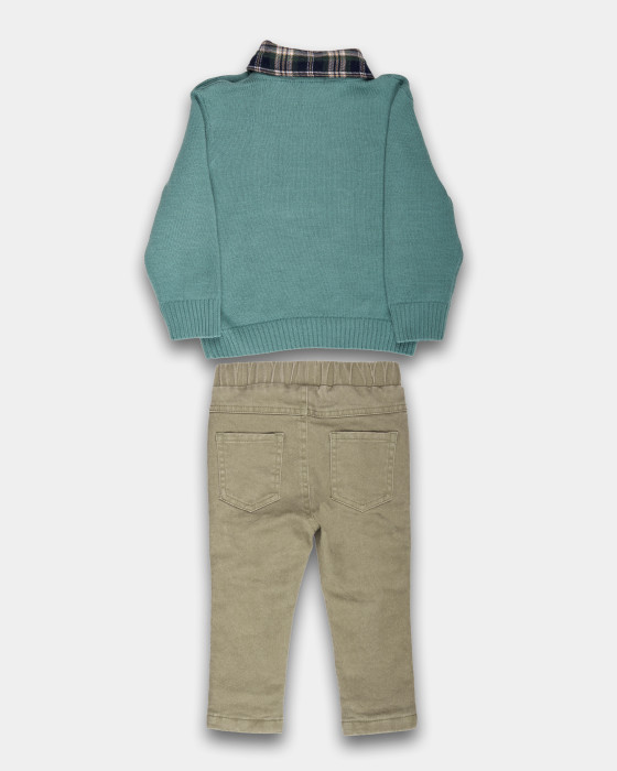 Este conjunto ofrece un estilo sofisticado y cómodo ideal para ocasiones especiales o el día a día.El jersey de tricot en tono verde agua lleva un divertido bordado y un cuello de camisa con estampado tartán (o cuadros), creando un look de dos piezas superpuesto muy elegante. El pantalón de gabardina color camel (o beige) es el complemento perfecto.El pantalón (98% Algodón / 2% Elastano) garantiza