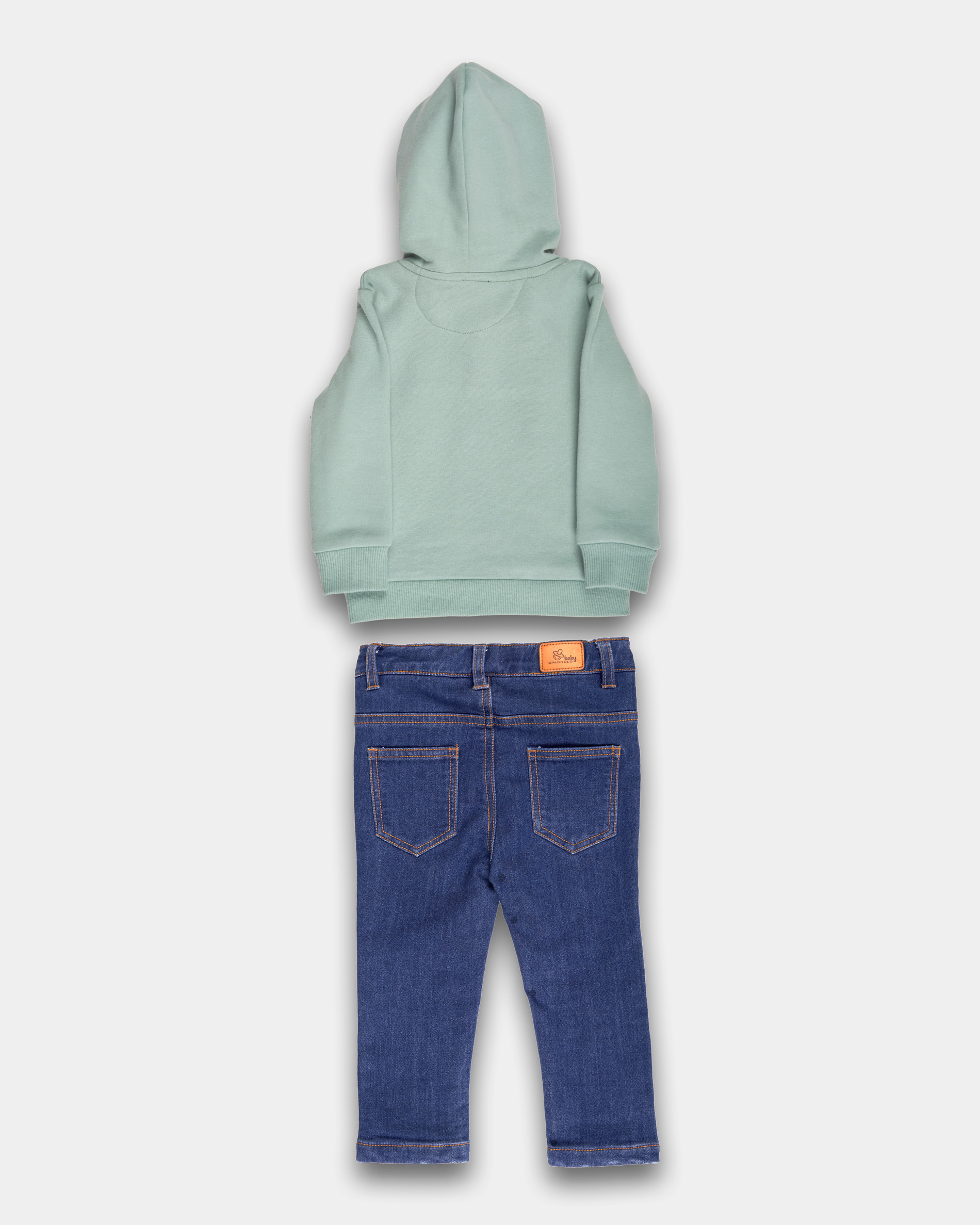 Este conjunto es ideal para un estilo casual y moderno, garantizando la máxima comodidad y resistencia para el día a día.La sudadera con capucha en color verde menta está confeccionada en tejido suave de Terry (felpa no especificada) y lleva un divertido diseño de osito. Combina con un pantalón vaquero denim clásico, resistente y fácil de llevar para todas sus aventuras.Una combinación versátil y