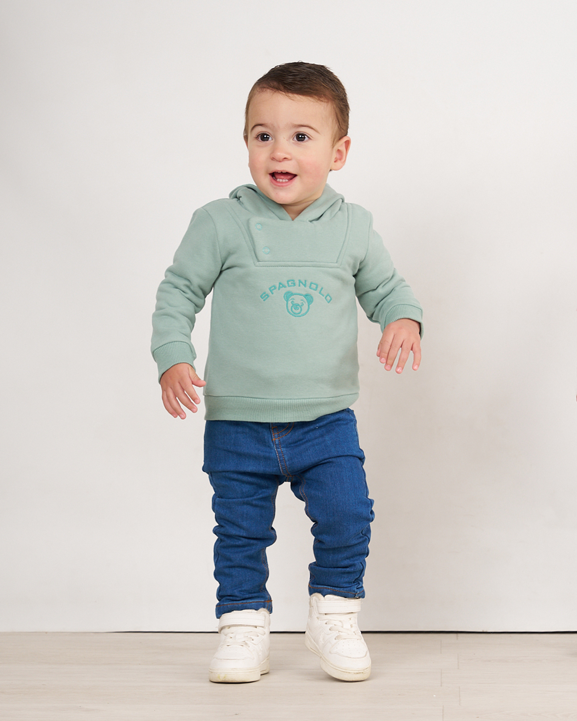 Este conjunto es ideal para un estilo casual y moderno, garantizando la máxima comodidad y resistencia para el día a día.La sudadera con capucha en color verde menta está confeccionada en tejido suave de Terry (felpa no especificada) y lleva un divertido diseño de osito. Combina con un pantalón vaquero denim clásico, resistente y fácil de llevar para todas sus aventuras.Una combinación versátil y