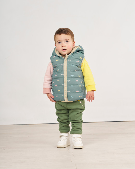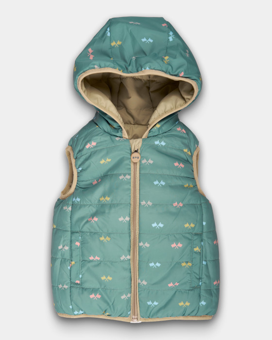 Este chaleco es una prenda dos en uno perfecta para ofrecer calor sin sacrificar la libertad de movimiento.Confeccionado con tejido técnico 100% Poliéster, es ligero, resistente y fácil de cuidar. Se puede usar por el lado beige acolchado para un look neutro, o por el lado verde con divertido estampado de banderas para un toque de color. Incluye una capucha para mayor protección.Una prenda versáti