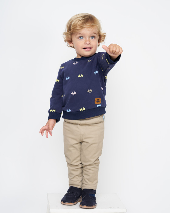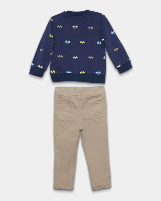 Este conjunto es perfecto para garantizar máxima comodidad y un estilo casual a los más pequeños.La sudadera de single jersey está confeccionada en 100% Algodón, un tejido suave y transpirable que ofrece confort diario y presenta un divertido estampado de banderas. El pantalón de gabardina incorpora un 3% de elastano para un ajuste cómodo, resistente y con total libertad de movimiento.Un básico es