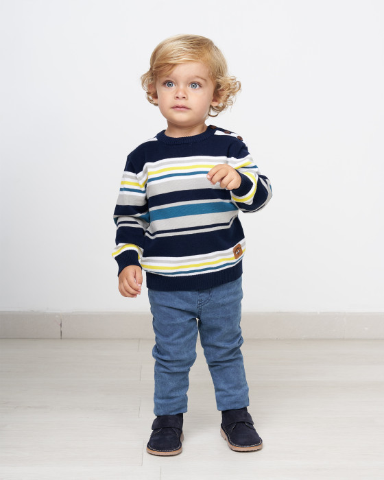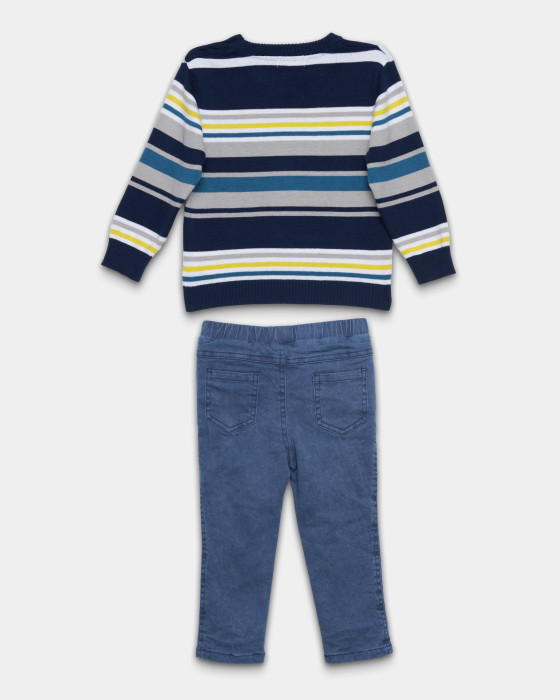 Este conjunto es perfecto para garantizar máxima comodidad y un estilo casual a los más pequeños.El jersey de rayas está confeccionado en punto 100% Algodón, un tejido suave y transpirable que ofrece confort diario. El pantalón de gabardina incorpora un 3% de elastano para un ajuste cómodo, resistente y con total libertad de movimiento.Un básico esencial y versátil para el juego y el tiempo libre.