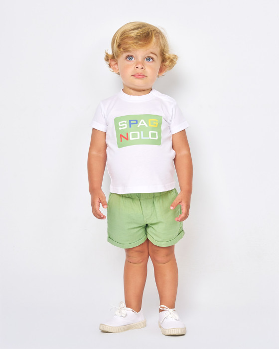 Conjunto infantil de Spagnolo ideal para un look casual y moderno. Incluye camiseta de manga corta con logo frontal distintivo. Bermuda lino con acabado suave y cómodo. Diseñado con tejidos ligeros para el día a día. Perfecto para verano, combinando estilo y funcionalidad. Disponible en varios colores para adaptarse a cada estilo.