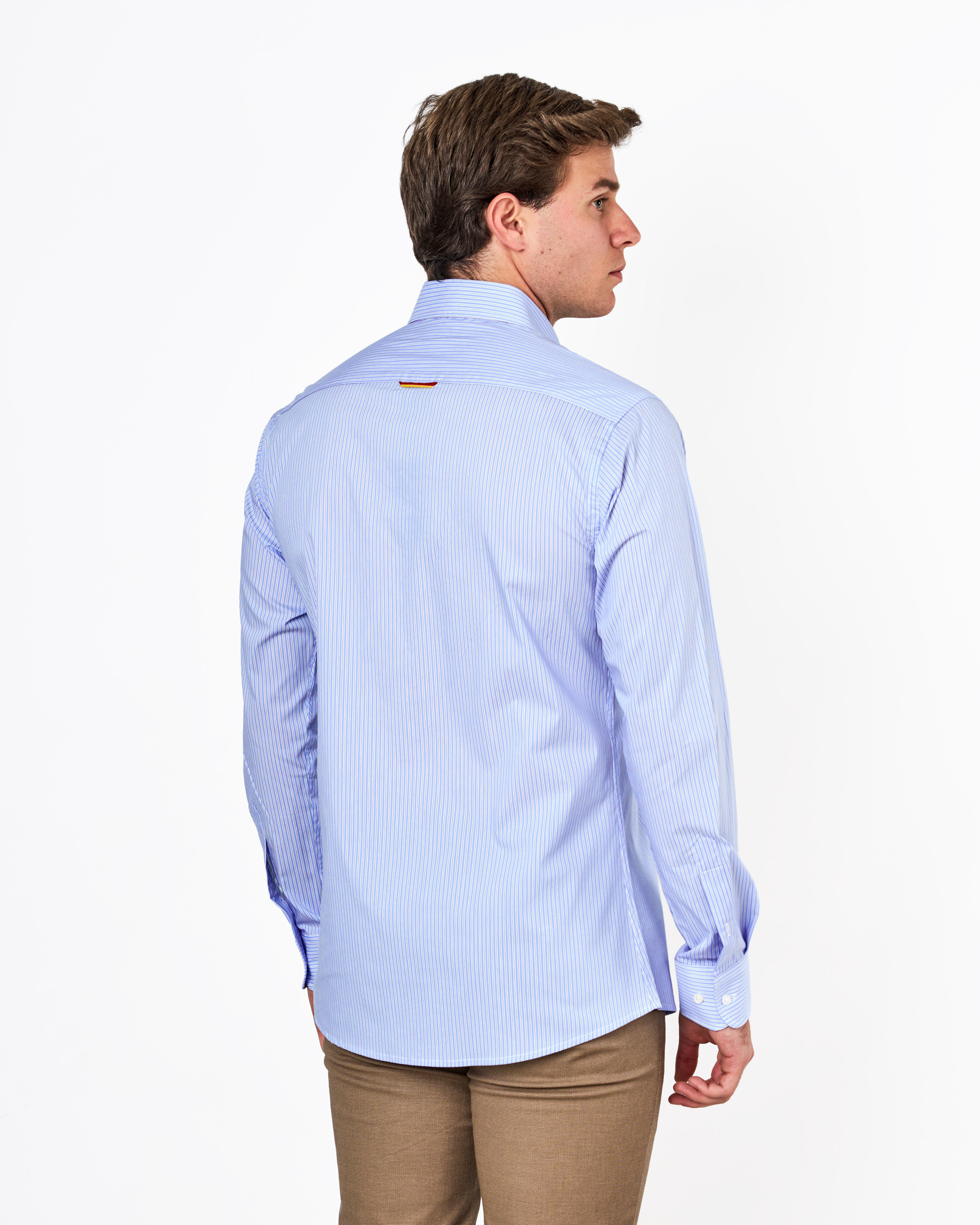 Renueva tu look con esta camisa de popelín de manga larga. El diseño de finas rayas verticales aporta un aire moderno y sofisticado, ideal para cualquier situación. Confeccionada con una mezcla de popelín (70% algodón, 28% poliéster, 2% elastano), ofrece un ajuste cómodo y un ligero toque elástico para mayor libertad de movimiento. Su cuello cutaway y el sutil logo bordado realzan la elegancia de