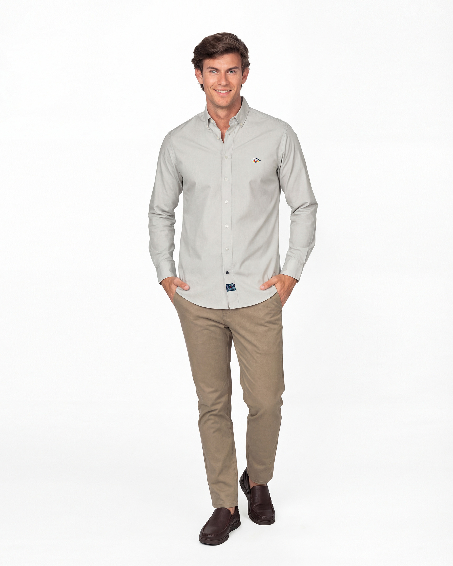 Camisa de hombre confeccionada en tejido Fil a Fil 100% algodón, que aporta suavidad, transpirabilidad y un acabado elegante. Presenta cuello con botón que mantiene una forma impecable durante todo el día. Su diseño clásico en color blanco la convierte en una prenda versátil, ideal tanto para looks formales como casuales. Incluye detalle de bandera de España bordada, aportando un toque distintivo y exclusivo.