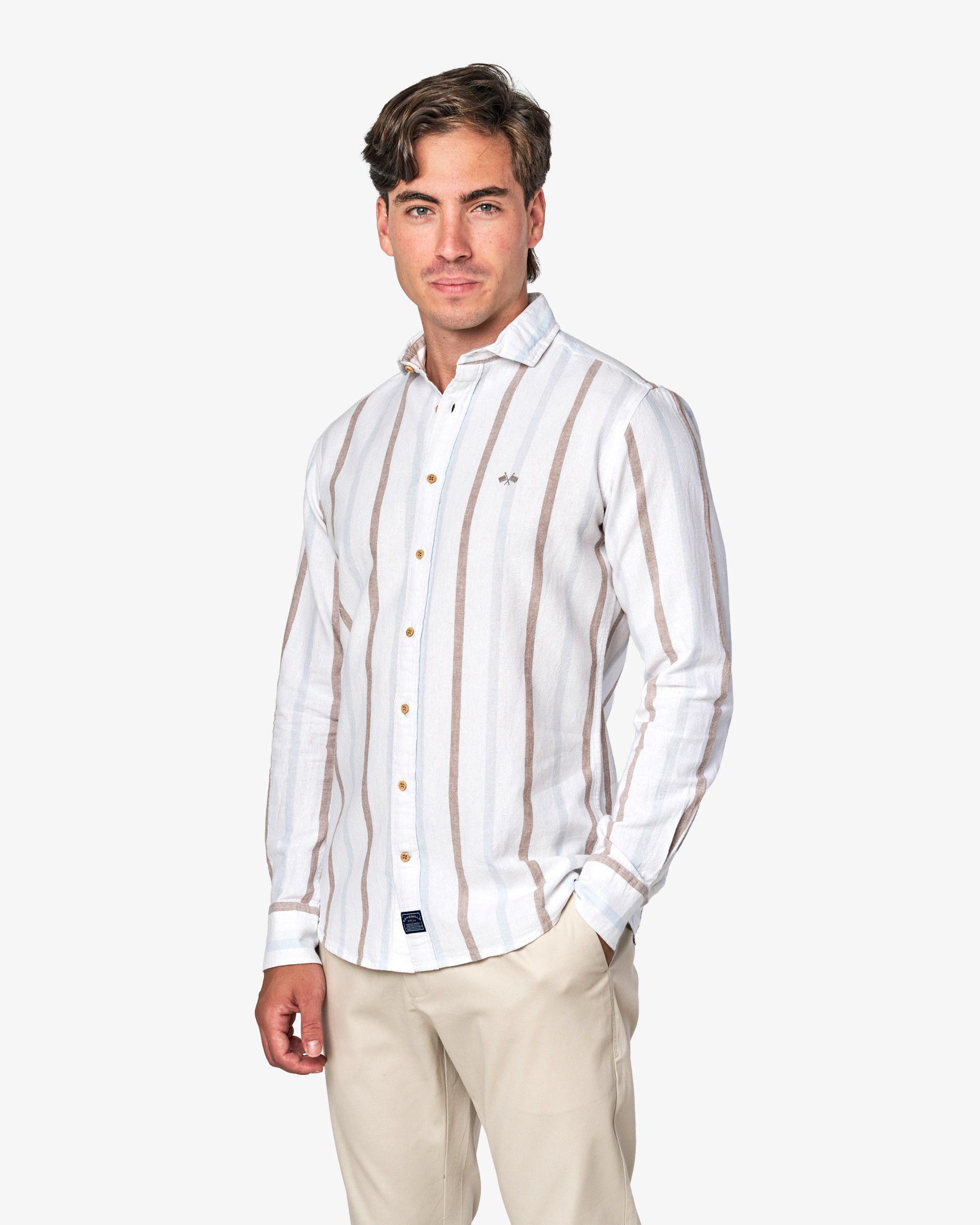 Añade un aire fresco con la camisa rústica de rayas Spagnolo. Su tejido de textura orgánica ofrece una transpirabilidad superior y ligereza ideal para el buen tiempo. El patrón de rayas verticales estiliza la figura, mientras que el logo bordado garantiza la autenticidad de la firma. Una prenda atemporal y elegante, perfecta para combinar con lino o chinos en un look estival impecable.