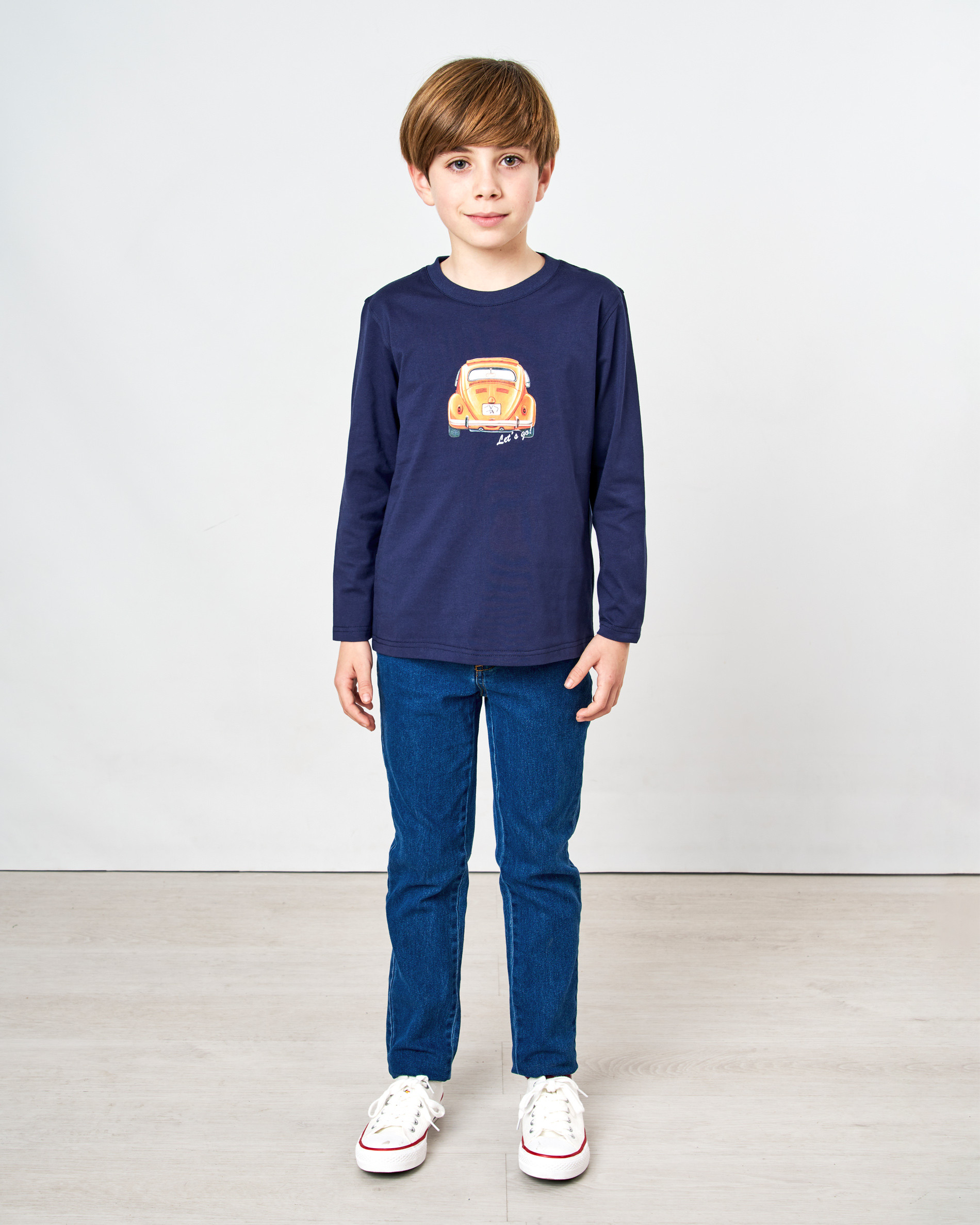 Esta camiseta infantil de manga larga es ideal para los más pequeños. Confeccionada en punto liso de 100% algodón, ofrece una suavidad y un confort excepcionales para el día a día. El diseño destaca por su original y vibrante estampado de un coche clásico en el pecho con la frase "Let's go!". Presenta un cuello redondo clásico. Una prenda cómoda y divertida para su armario casual.