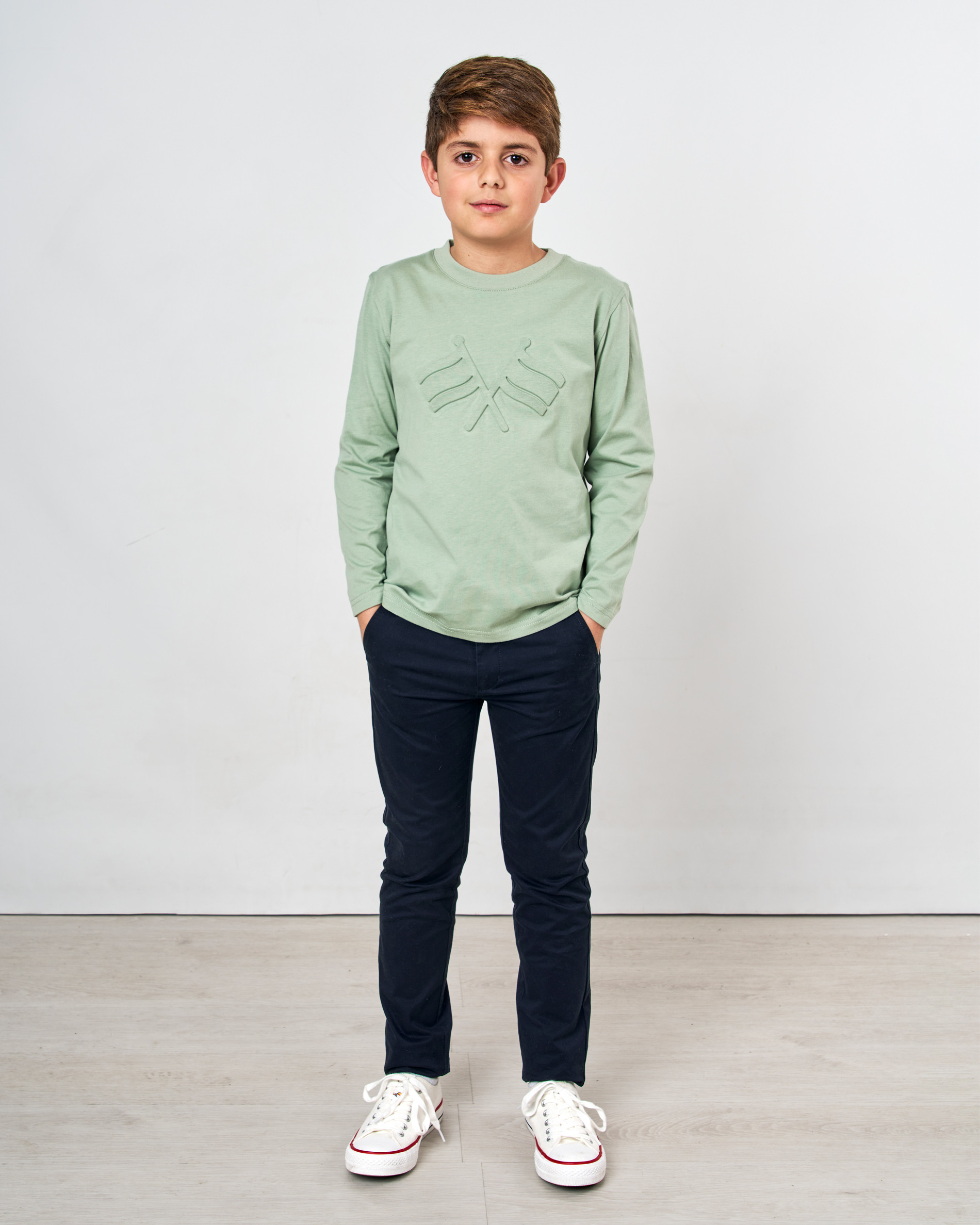 Esta camiseta infantil de manga larga es una pieza básica con un toque distintivo. Confeccionada en punto liso de 100% algodón, ofrece suavidad y una comodidad inigualable para el día a día. El diseño es sencillo y se realza con un discreto motivo en relieve de banderas cruzadas en el pecho. Presenta un cuello redondo clásico. Ideal para un look casual y confortable.