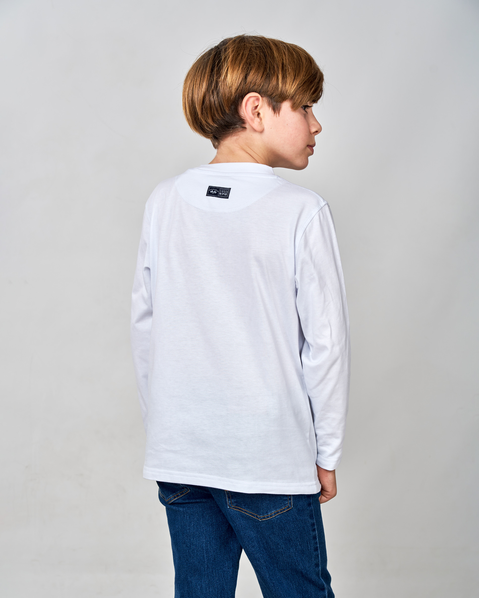 Esta camiseta infantil de manga larga es una pieza básica para cualquier armario. Confeccionada en punto liso de 100% algodón, ofrece una suavidad y un confort inigualables para el día a día. El diseño es sencillo, destacando el discreto logo de la marca estampado en el pecho. Presenta un cuello redondo clásico. Ideal para un look casual y cómodo.