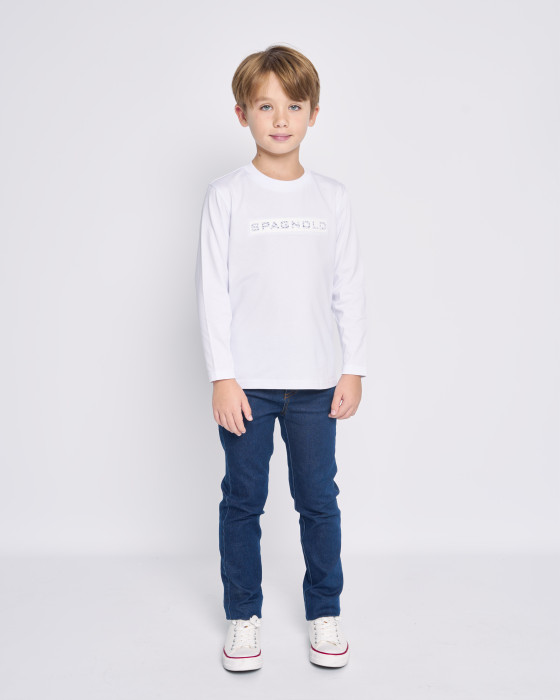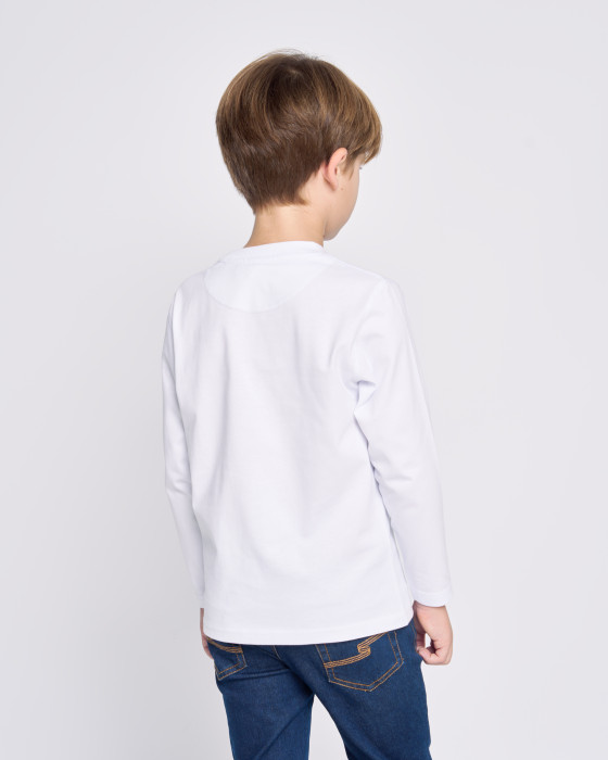 Camiseta versátil de cuello redondo y manga larga para niño. Ideal para el día a día. Diseño cómodo y suave al tacto que garantiza la libertad de movimiento. Presenta un logo moderno a la altura del pecho. ¡Un básico perfecto para la temporada!