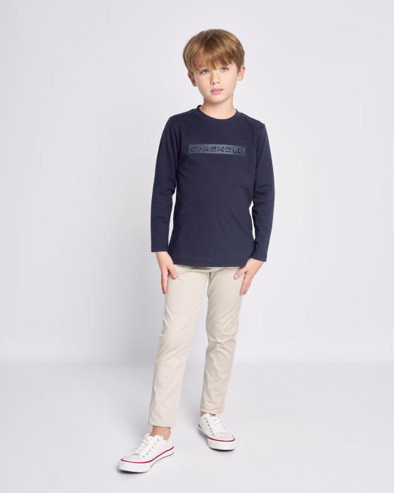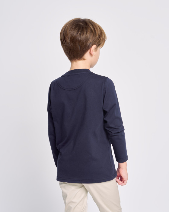 Camiseta versátil de cuello redondo y manga larga para niño. Ideal para el día a día. Diseño cómodo y suave al tacto que garantiza la libertad de movimiento. Presenta un logo moderno a la altura del pecho. ¡Un básico perfecto para la temporada!