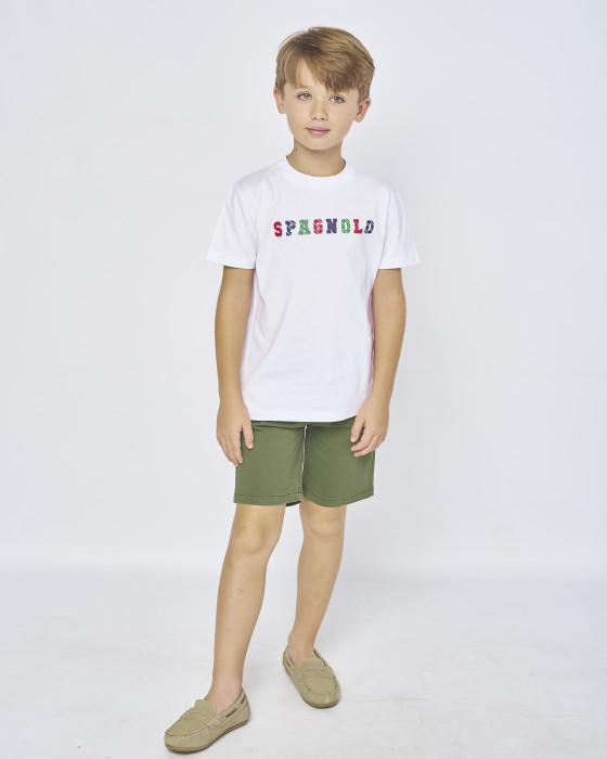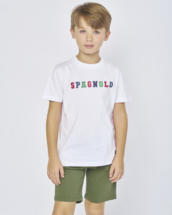 Camiseta infantil blanca con logo multicolor de Spagnolo. Diseño cómodo en algodón, ideal para looks casuales de niño en primavera y verano.