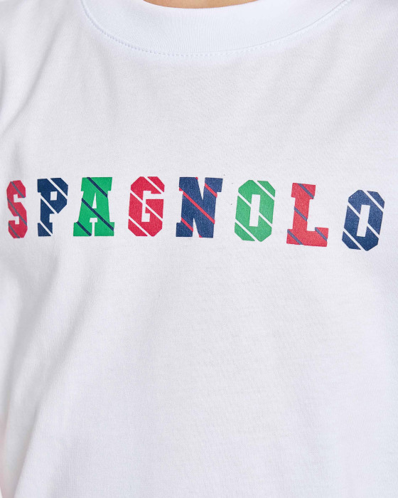 Destaca el logo SPAGNOLO en el pecho con letras multicolor que aportan un toque alegre y moderno.