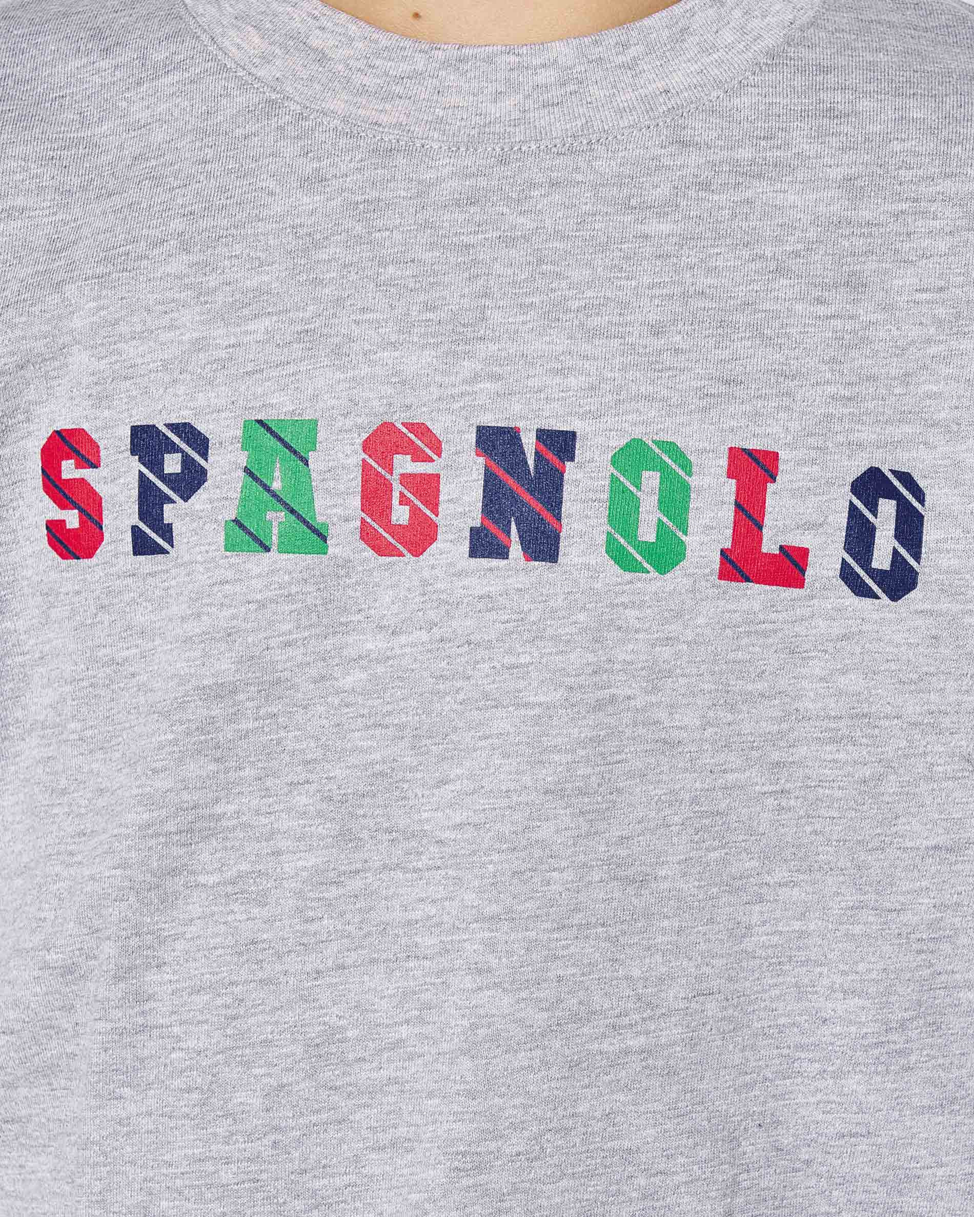 Destaca el logo SPAGNOLO en el pecho con letras multicolor que aportan un toque alegre y moderno.