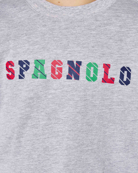 Destaca el logo SPAGNOLO en el pecho con letras multicolor que aportan un toque alegre y moderno.