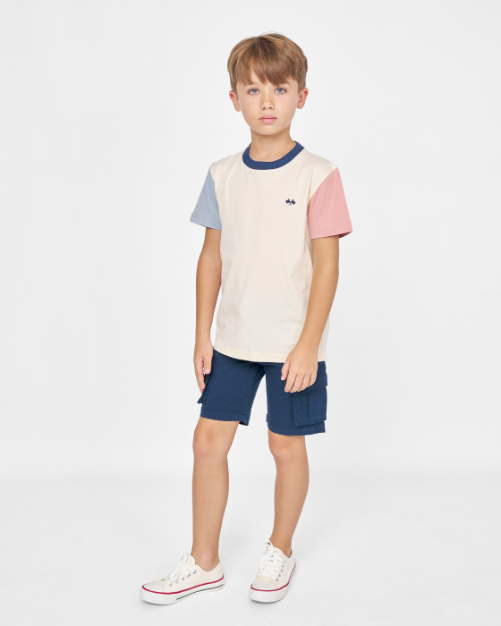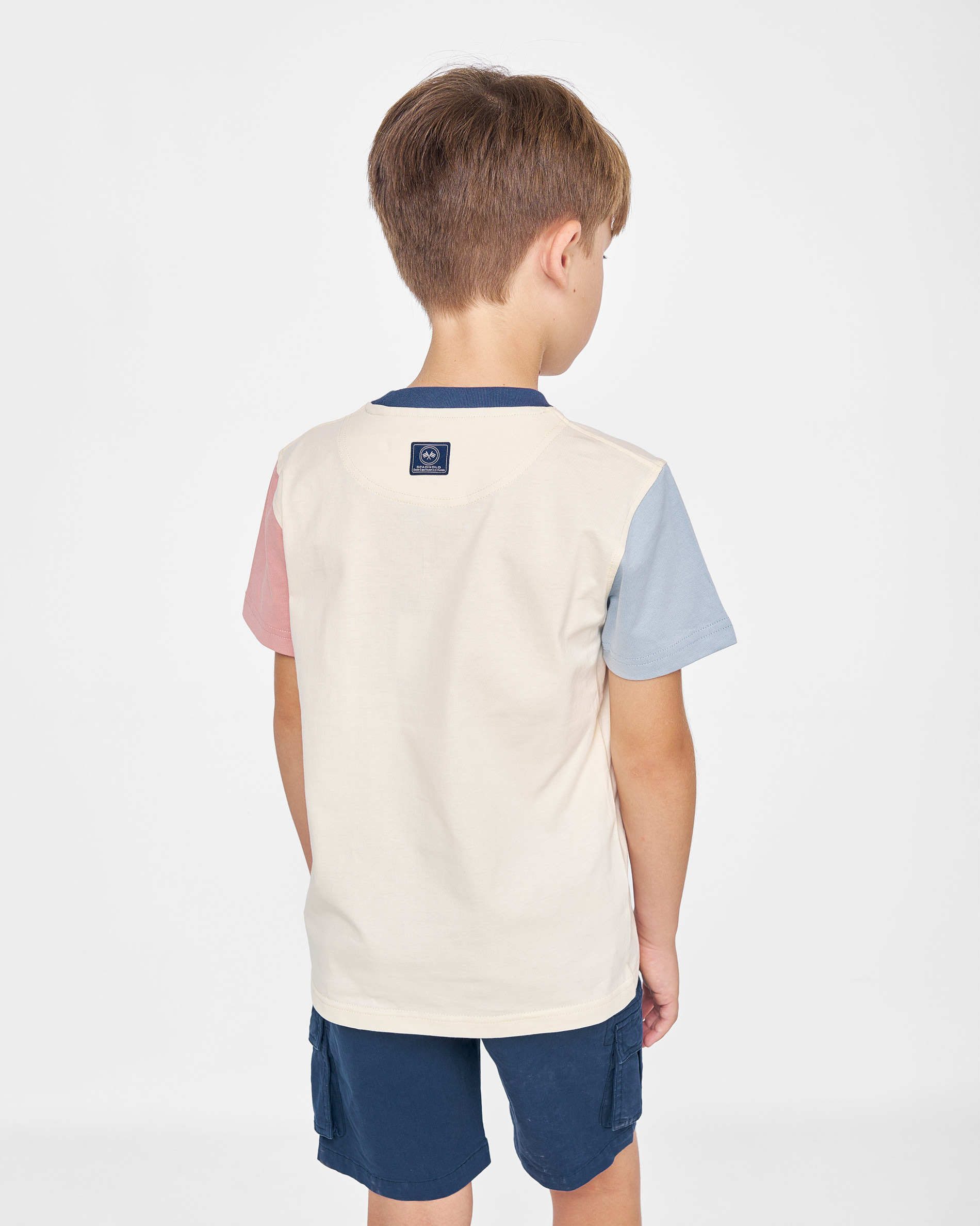 Camiseta infantil de Spagnolo con diseño moderno y detalles en contraste. Combina cuerpo en tono beige con mangas en colores azul y rosa que aportan un estilo actual. Confeccionada en tejido suave y transpirable para garantizar comodidad durante todo el día. Incluye el icónico logo bordado en el pecho que aporta identidad a la prenda. Diseño de manga corta y cuello redondo, perfecto para la tempor