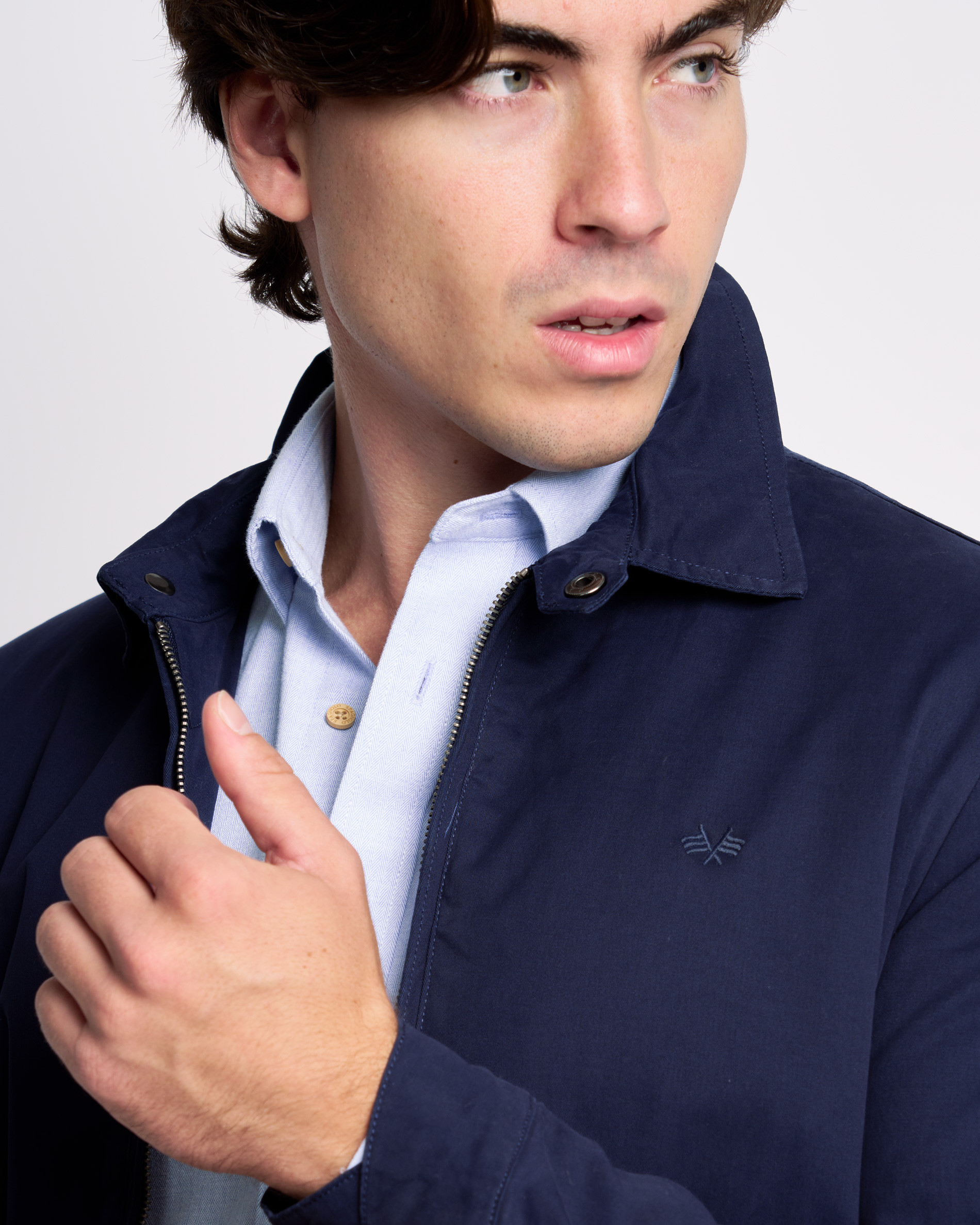 Cazadora de hombre tipo Harrington de estilo atemporal, ideal para un look pulido y casual. Confeccionada en un tejido liso y ligero de color azul marino, perfecta para el entretiempo.Presenta un corte recto y elegante con el distintivo cuello camisero y cierre frontal de cremallera metálica de doble carro. El diseño se completa con puños y bajo ligeramente elásticos y un discreto logo corporativo