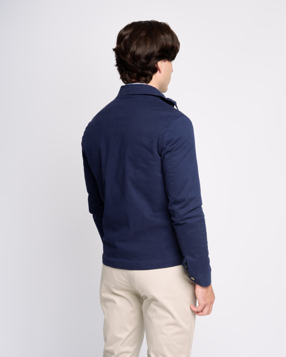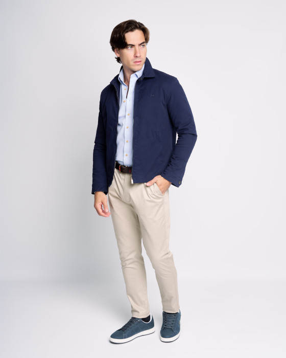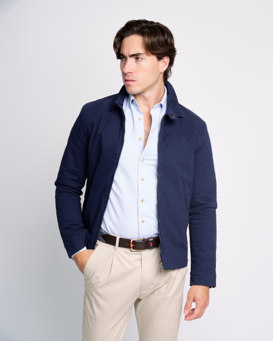 Cazadora de hombre tipo Harrington de estilo atemporal, ideal para un look pulido y casual. Confeccionada en un tejido liso y ligero de color azul marino, perfecta para el entretiempo.Presenta un corte recto y elegante con el distintivo cuello camisero y cierre frontal de cremallera metálica de doble carro. El diseño se completa con puños y bajo ligeramente elásticos y un discreto logo corporativo