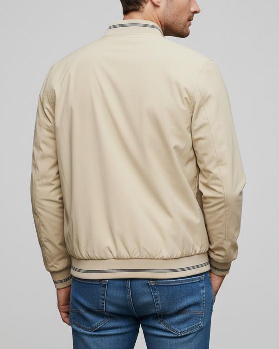 Cazadora masculina versátil de corte clásico y tejido ligero ideal para entretiempo. Con acabados elásticos en cuello, puños y bajo, su cierre y logotipo sutil aportan un toque deportivo y elegante, disponible en azul marino y beige.
