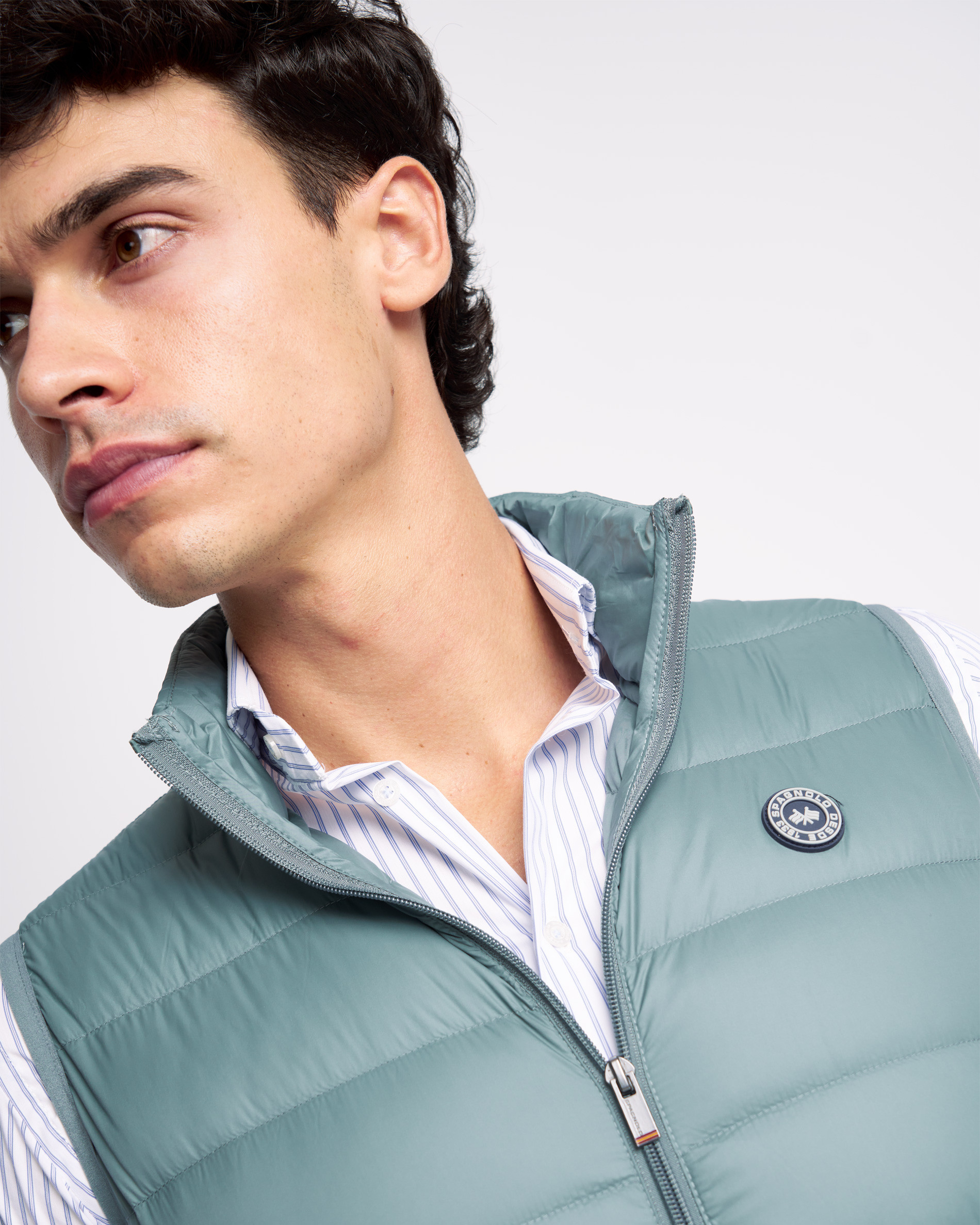 Un básico esencial para cualquier temporada, este chaleco de plumas te ofrece una calidez ligera sin volumen excesivo.Su diseño con acolchado horizontal le da un look moderno y atemporal. El relleno de plumas asegura un excelente aislamiento térmico, ideal para llevarlo sobre camisas o jerséis.Cuenta con un cuello alzado para protegerte del viento, cierre de cremallera frontal y un discreto parche
