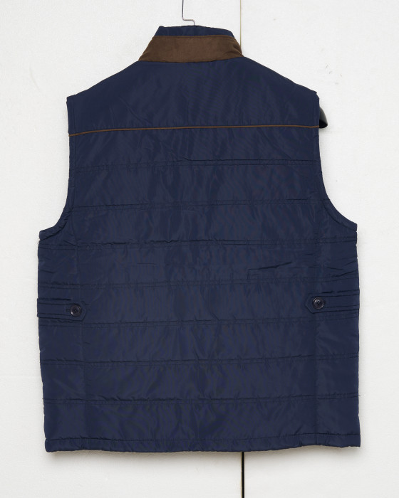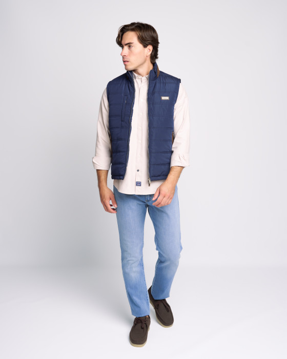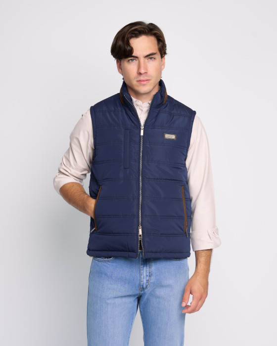 Este chaleco acolchado waterproof es ideal para el entretiempo. Ligero y funcional, combina estilo y protección con su diseño azul marino y detalles marrones en cuello y ribetes. Incluye cierre y bolsillos con cremallera. Perfecto sobre camisas o jerséis.