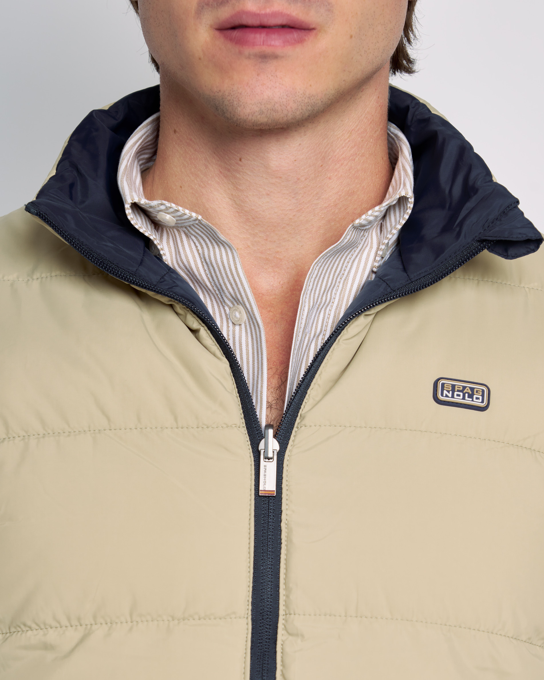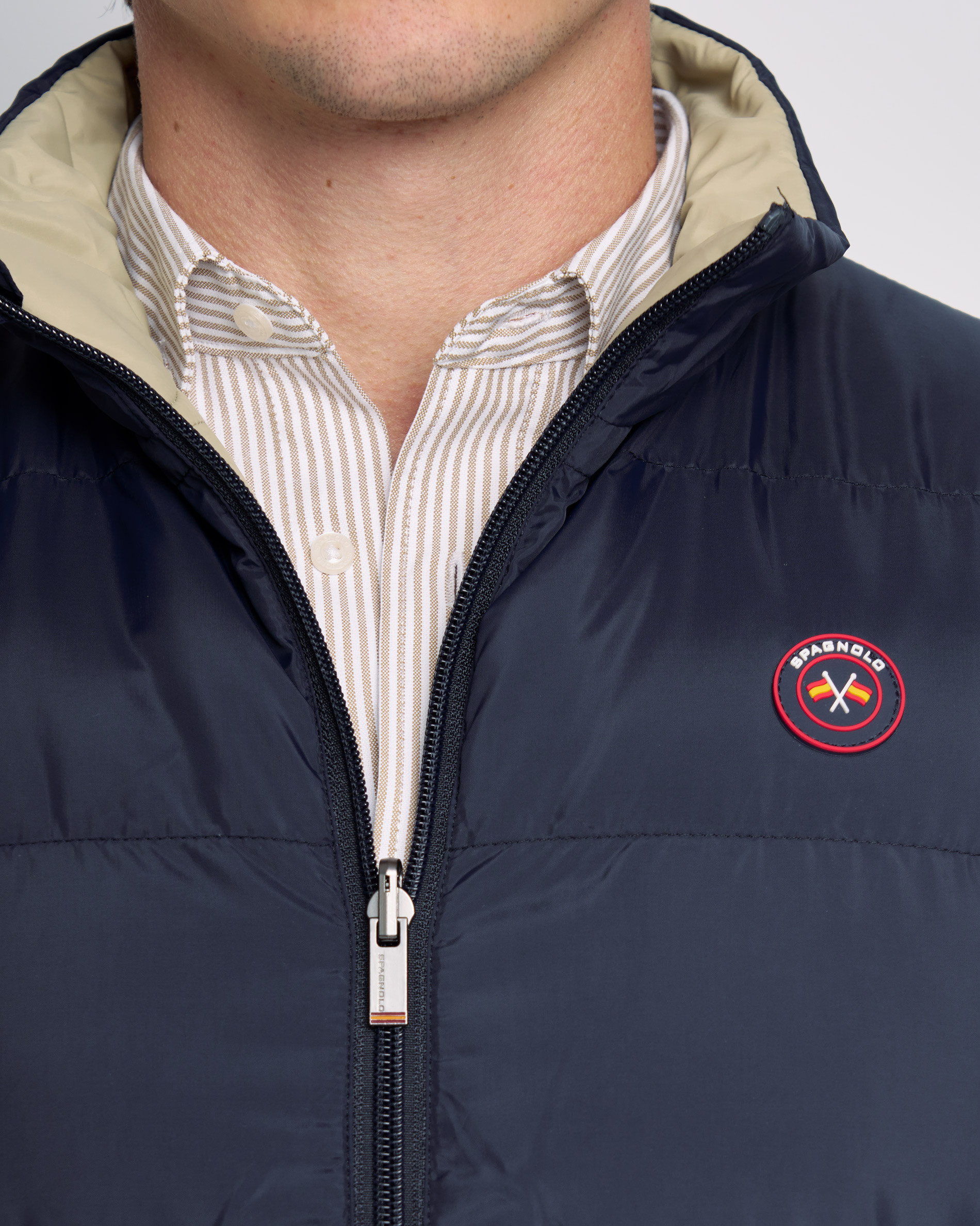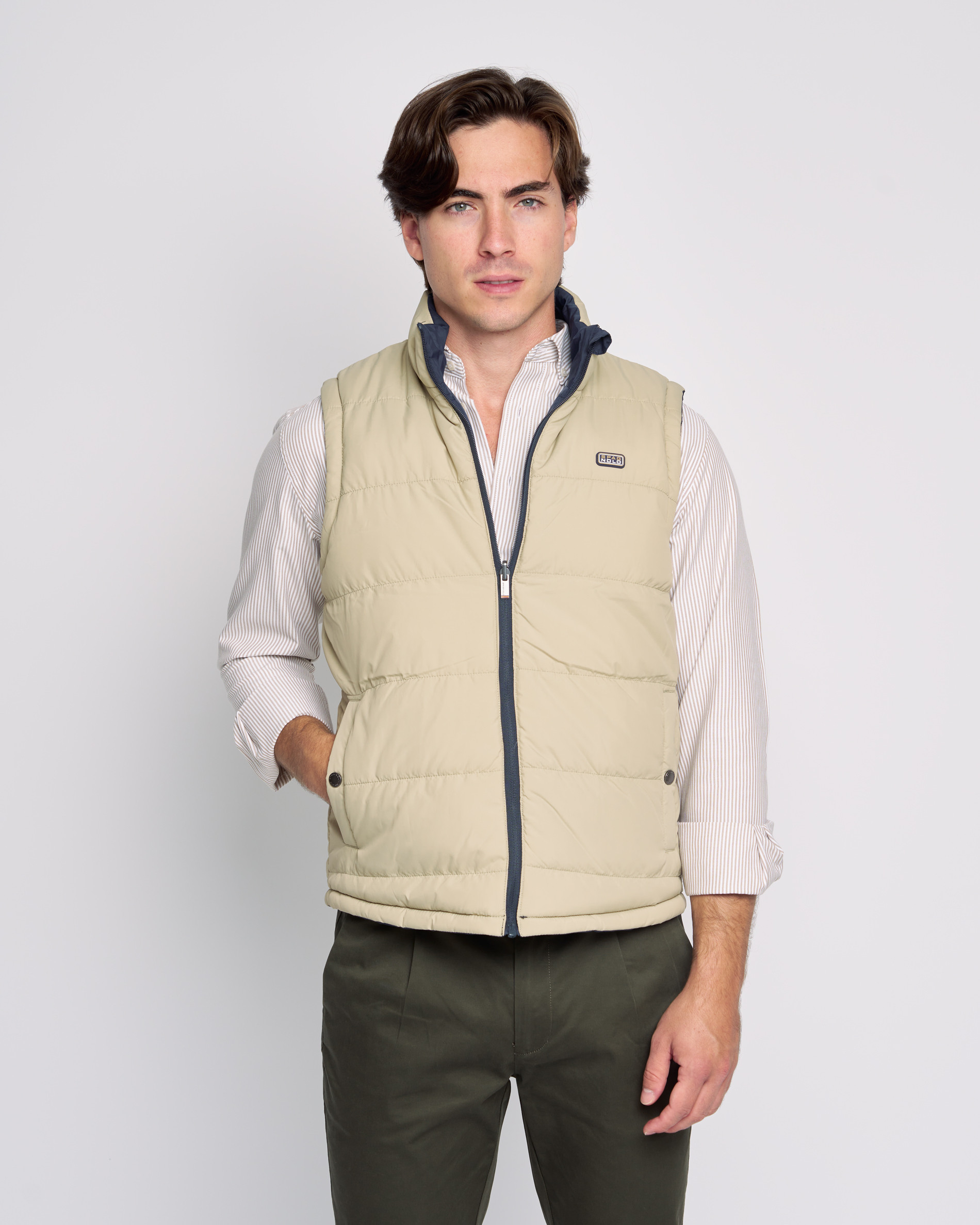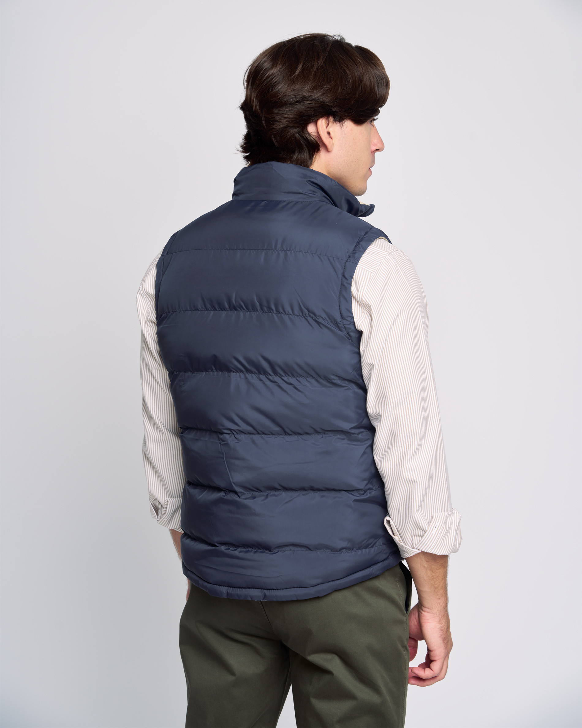 El chaleco reversible acolchado combina estilo y funcionalidad. Ligero y cálido, ofrece dos looks en uno: uno elegante y otro más moderno con detalles gráficos. Con cuello alto, cremallera y bolsillos en ambos lados. Disponible también en tallas de niño.