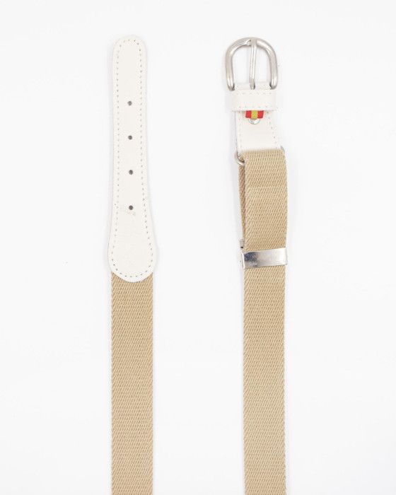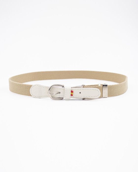 Cinturón elástico infantil. Personalizado con detalles en piel y hebilla metálica. Presenta logo de banderas Spagnolo en extremo y detalle de la bandera de España.