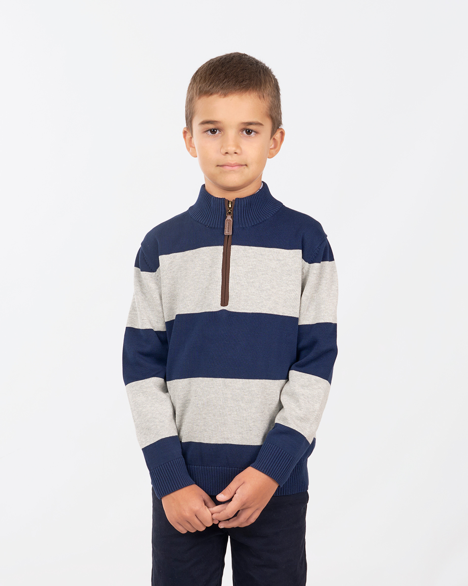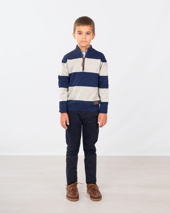 Jersey tejido punto de niño estampado rayas. Cuello pádel cierre cremallera. Etiqueta Spagnolo bordado en cuero.