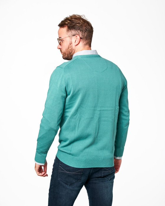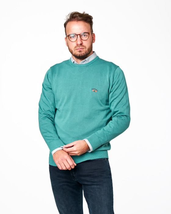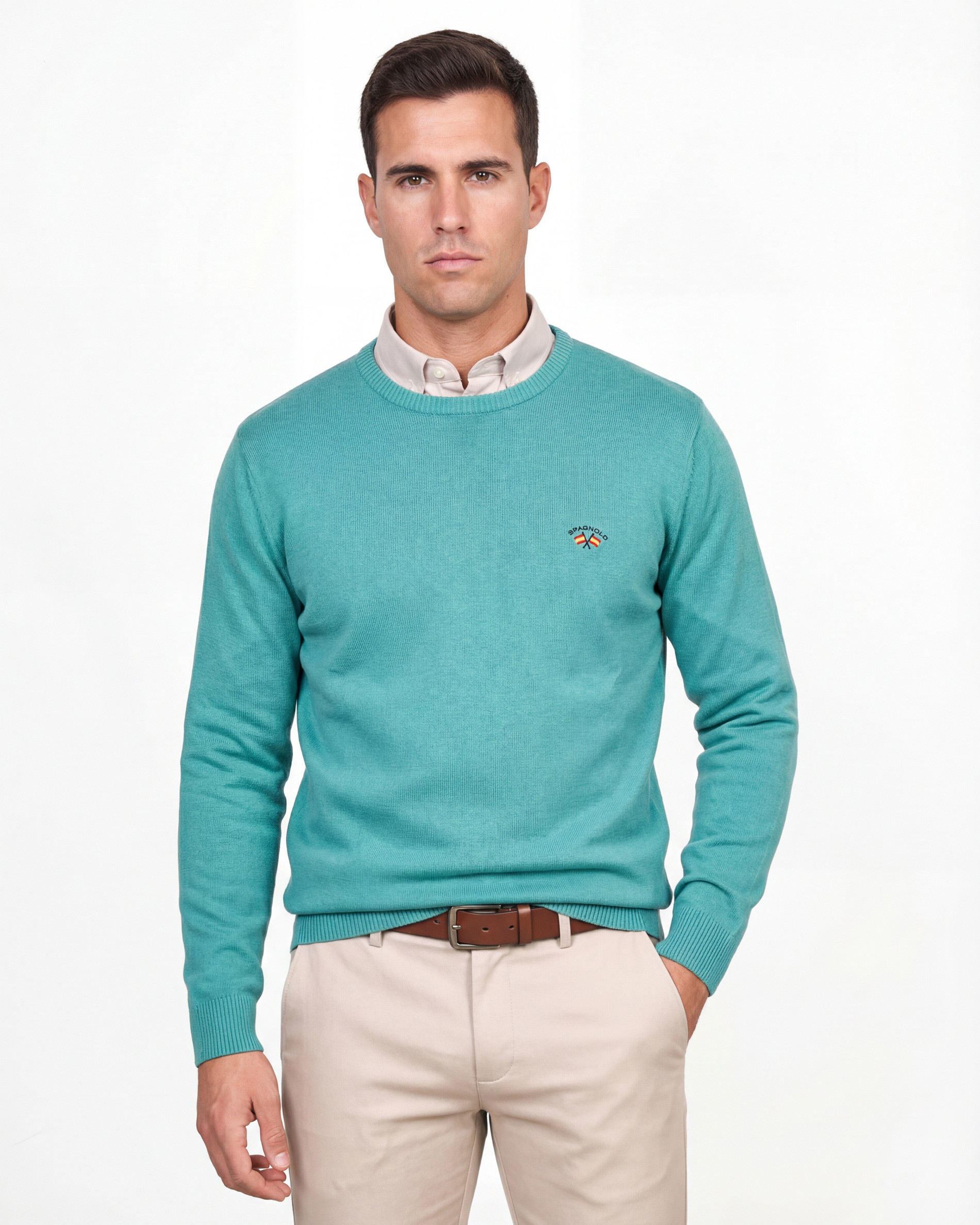 Este jersey de cuello caja es una prenda básica y elegante, confeccionado en punto fino (galga 12) que aporta suavidad y ligereza. Perfecto para llevar sobre camisa o camiseta, con diseño clásico y logo bordado, ideal para oficina o looks casual.