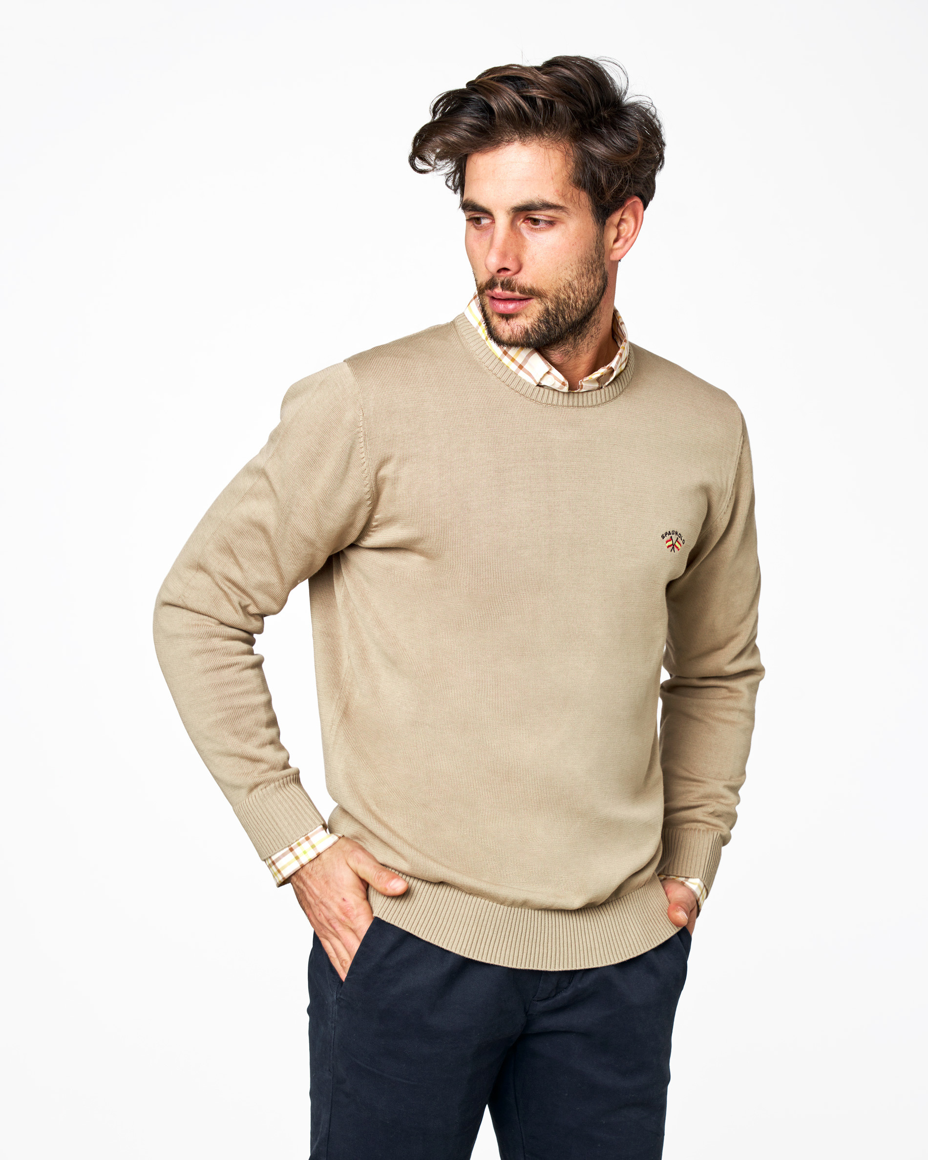 Este jersey de cuello caja es una prenda básica y elegante, confeccionado en punto fino (galga 12) que aporta suavidad y ligereza. Perfecto para llevar sobre camisa o camiseta, con diseño clásico y logo bordado, ideal para oficina o looks casual.