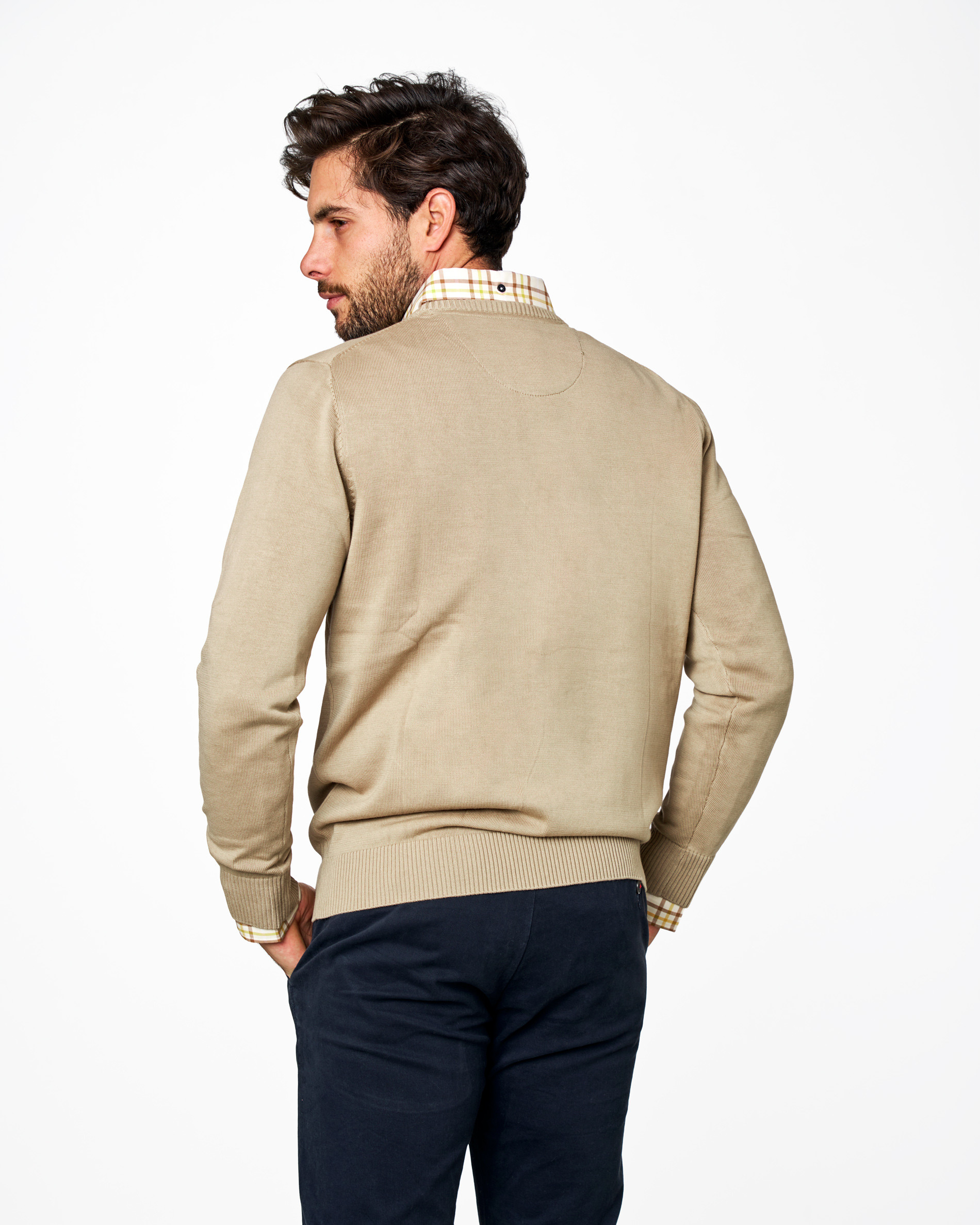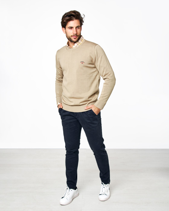 Este jersey de cuello caja es una prenda básica y elegante, confeccionado en punto fino (galga 12) que aporta suavidad y ligereza. Perfecto para llevar sobre camisa o camiseta, con diseño clásico y logo bordado, ideal para oficina o looks casual.