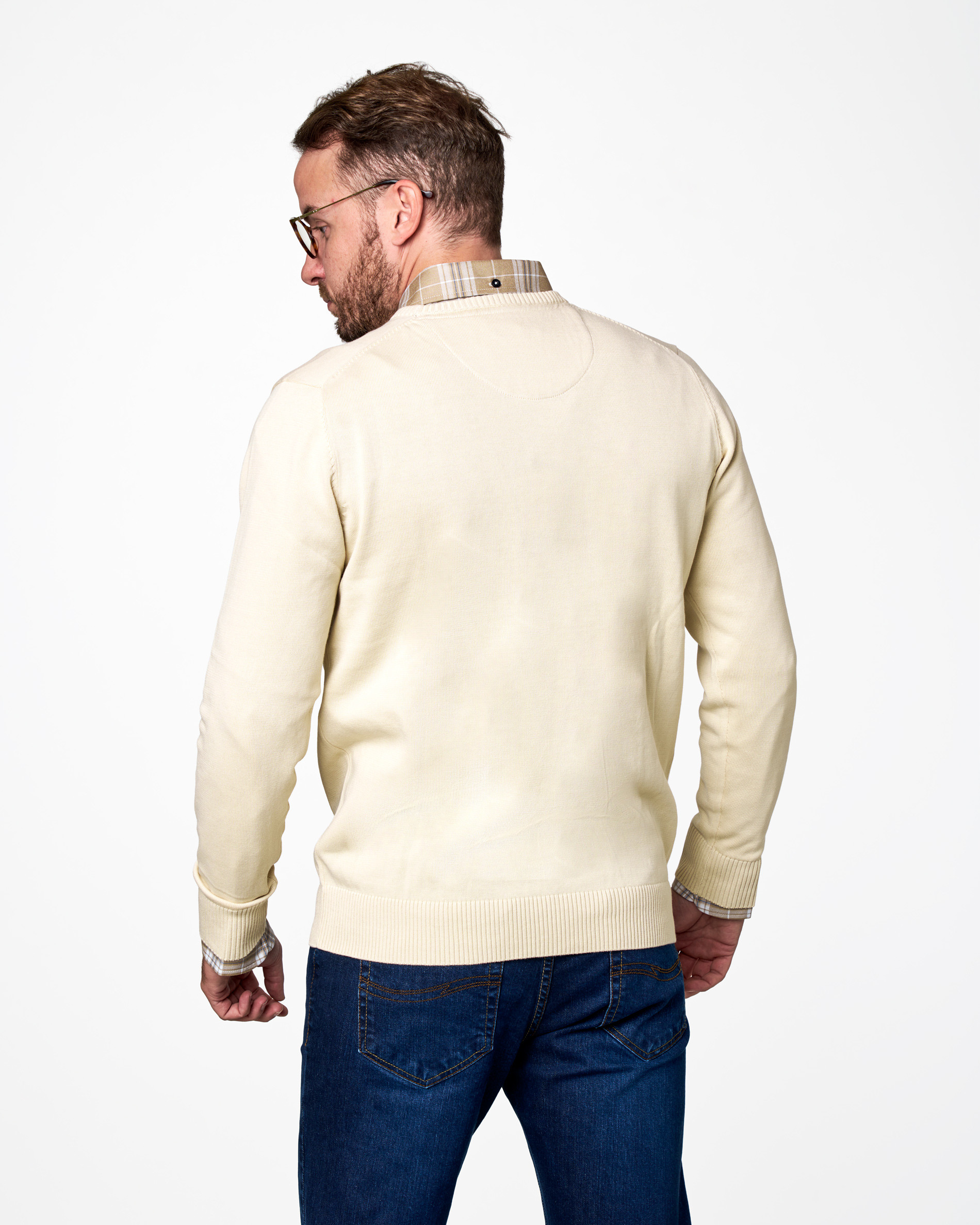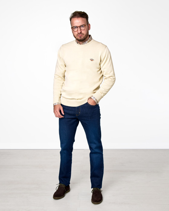 Este jersey de cuello caja es una prenda básica y elegante, confeccionado en punto fino (galga 12) que aporta suavidad y ligereza. Perfecto para llevar sobre camisa o camiseta, con diseño clásico y logo bordado, ideal para oficina o looks casual.