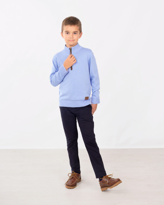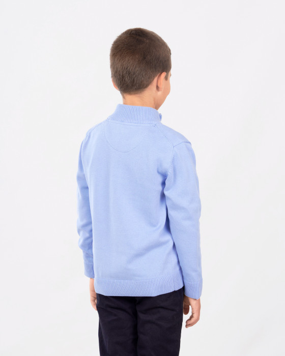 <p>Este jersey infantil es una prenda cómoda y versátil, perfecta para un estilo deportivo o casual. Confeccionado en punto (100% algodón), ofrece un tacto suave y calidez. Destaca por su cuello alto con media cremallera y el tirador con detalle en símil piel. El diseño es liso y cuenta con un discreto logo en el bajo. Es ideal para combinar sobre una camiseta o camisa.</p>