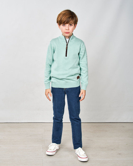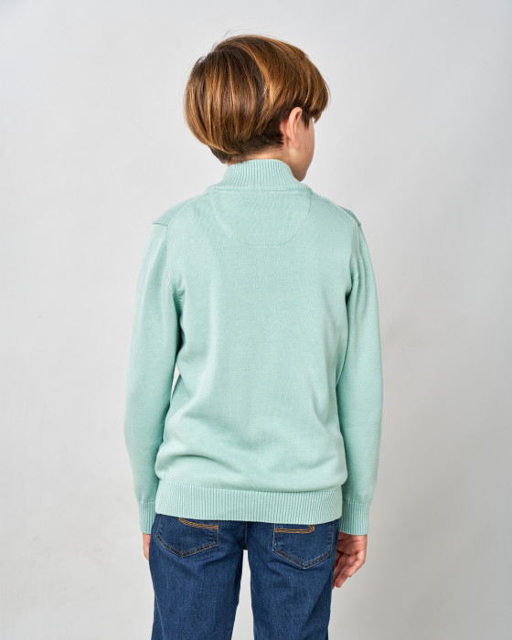 Este jersey infantil es una prenda cómoda y versátil, perfecta para un estilo deportivo o casual. Confeccionado en punto (100% algodón), ofrece un tacto suave y calidez. Destaca por su cuello alto con media cremallera y el tirador con detalle en símil piel. El diseño es liso y cuenta con un discreto logo en el bajo. Es ideal para combinar sobre una camiseta o camisa.