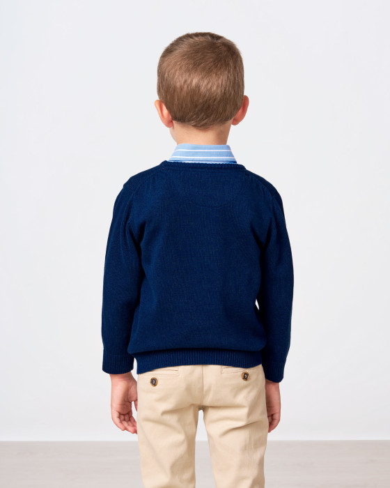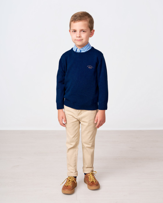 Suave jersey infantil de diseño contemporáneo. El pequeño logo de banderas en el pecho le da un toque distintivo y elegante. Confeccionado en 100% algodón, es la prenda perfecta para combinar con camisas o llevar solo. Máximo confort asegurado.