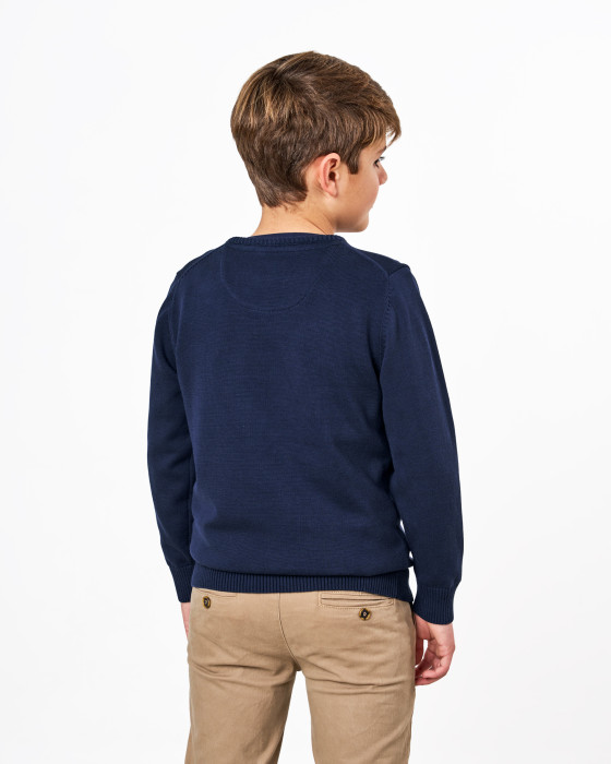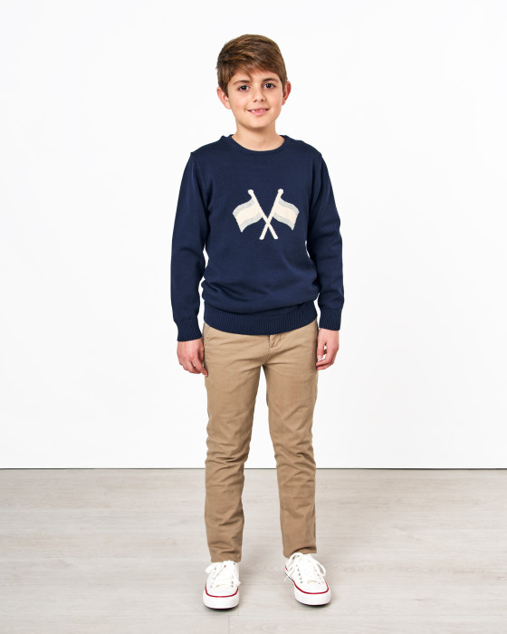 Cómodo jersey en color azul marino, perfecto para los más pequeños. El diseño con las banderas aplicadas le da un toque divertido y náutico. Confeccionado en 100% algodón, garantiza la suavidad y el confort que necesitan en su día a día.