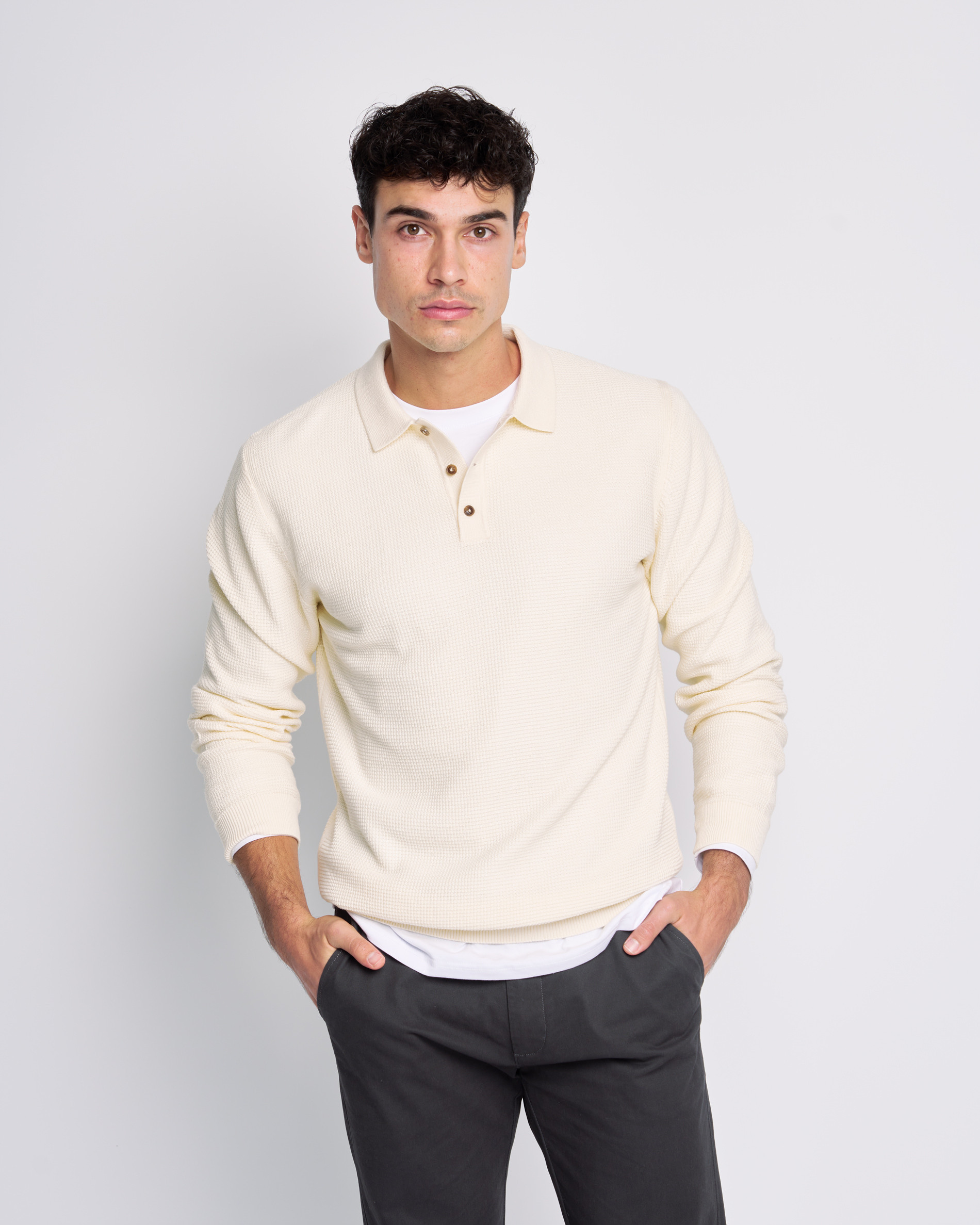 Combina la elegancia del polo con el confort del jersey. Confeccionado en un agradable punto liso texturizado, es ideal para un estilo smart casual. El cuello con botones le permite llevarse solo o con camisa. Comodidad, calidez y un look pulido garantizados.
