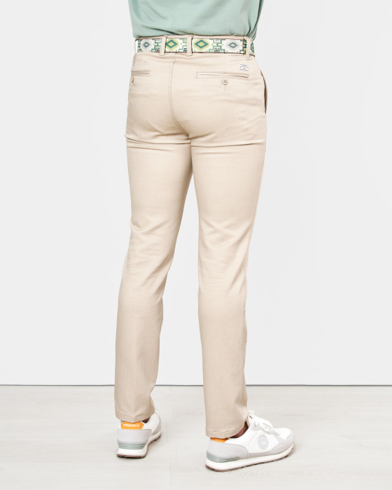 Pantalón chino con corte Slim Fit que ofrece elegancia y modernidad. Con estampado sutil y textura sofisticada, es ideal tanto para la oficina como para un look casual de fin de semana, combinable con zapatillas o zapatos formales.