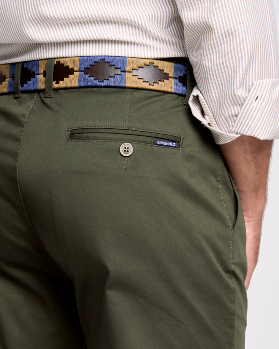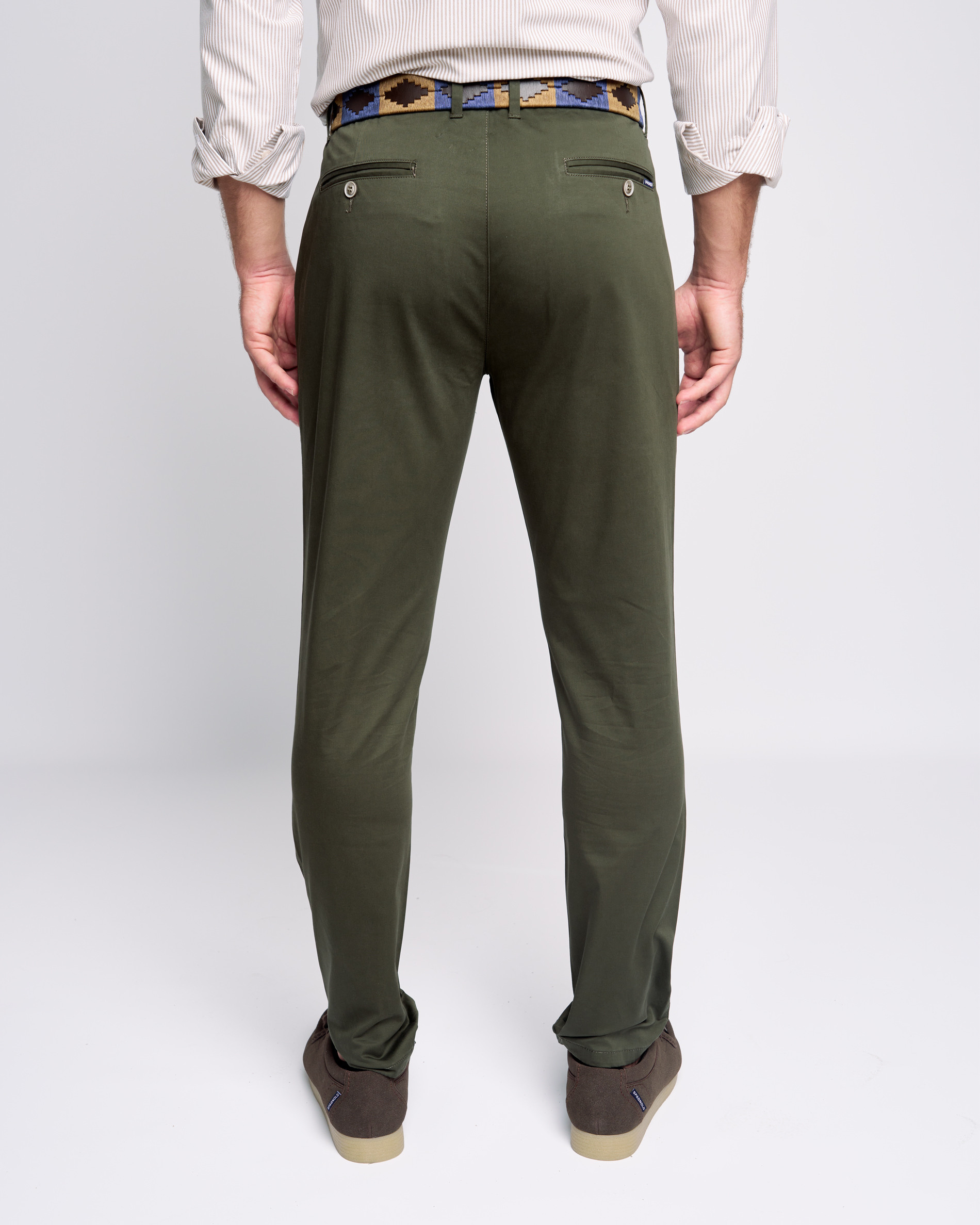 El pantalón chino que transita entre lo formal y casual. Presenta un corte moderno con pinzas para un ajuste perfecto y caída fluida. Ideal por su bajo ligeramente recortado. Combínalo con zapatillas o zapatos de vestir. Comodidad y estilo vanguardista.