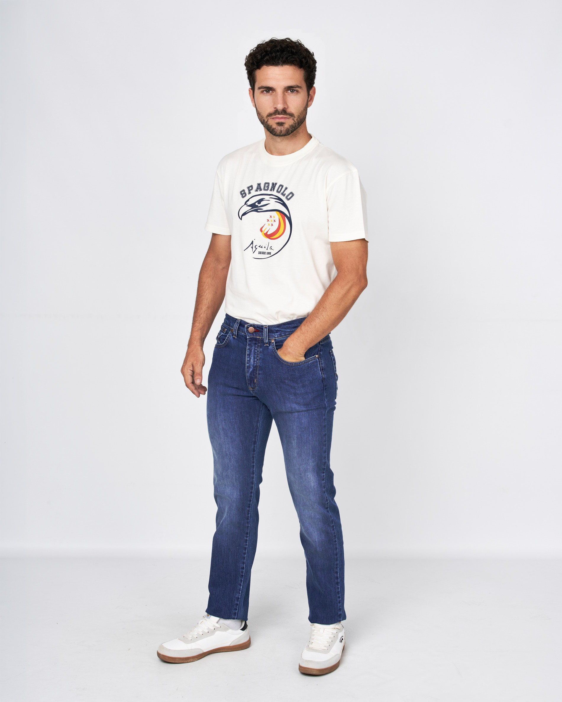 El pantalón vaquero de hombre de Spagnolo está confeccionado en tejido denim, un material resistente y cómodo ideal para el uso diario. Su diseño clásico de jeans de corte regular lo convierte en una prenda casual, perfecta para combinar con camisas, polos o camisetas. Tejido denim elastano. 98% Algodón 2% Elastano