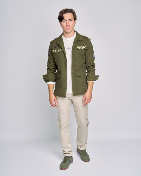 Parka sahariana robusta de gabardina lisa elástica ($98\%$ algodón). Máximo confort y libertad de movimiento. Diseño clásico con múltiples bolsillos funcionales y detalles militares. ¡Tu prenda casual perfecta para todo el año!