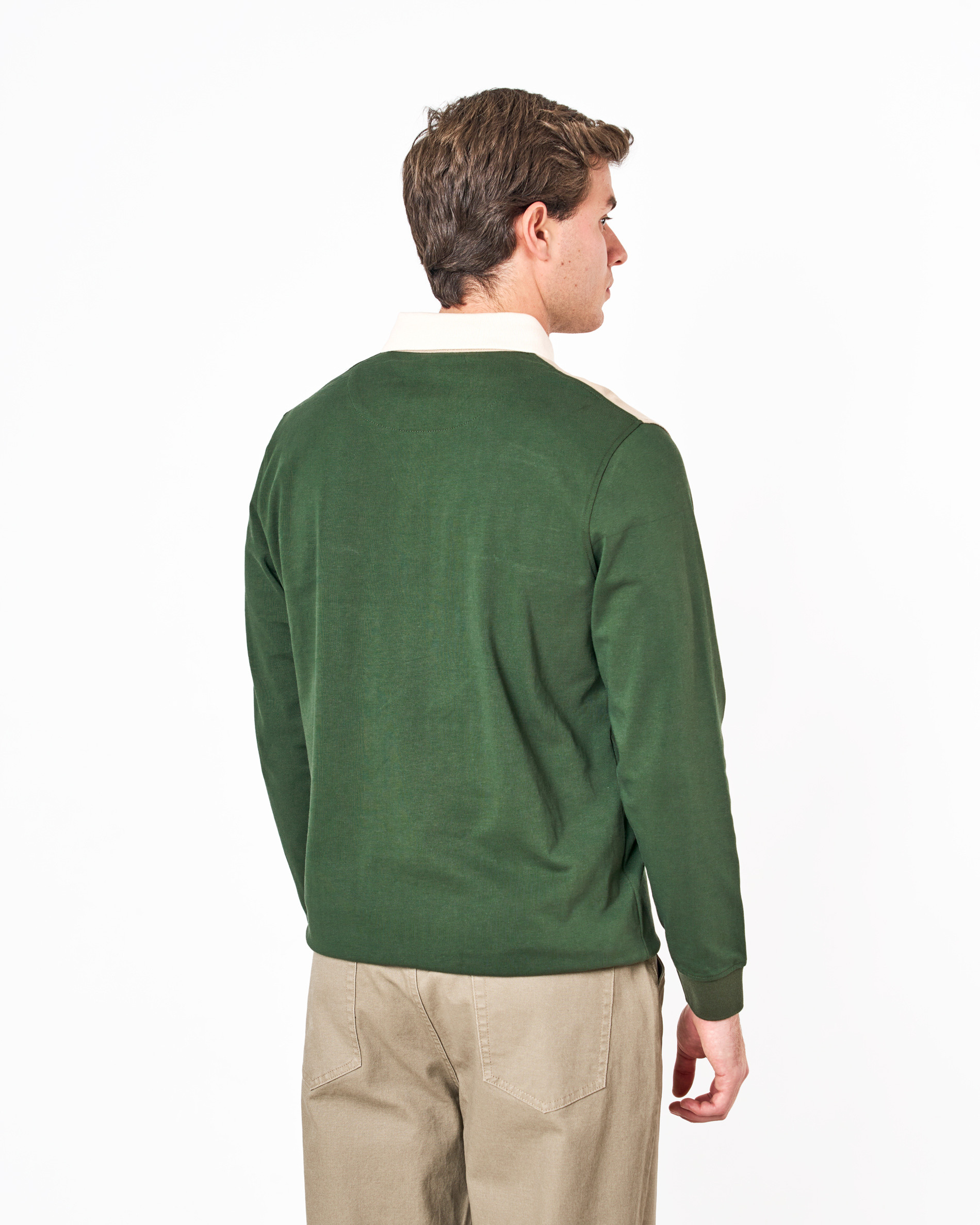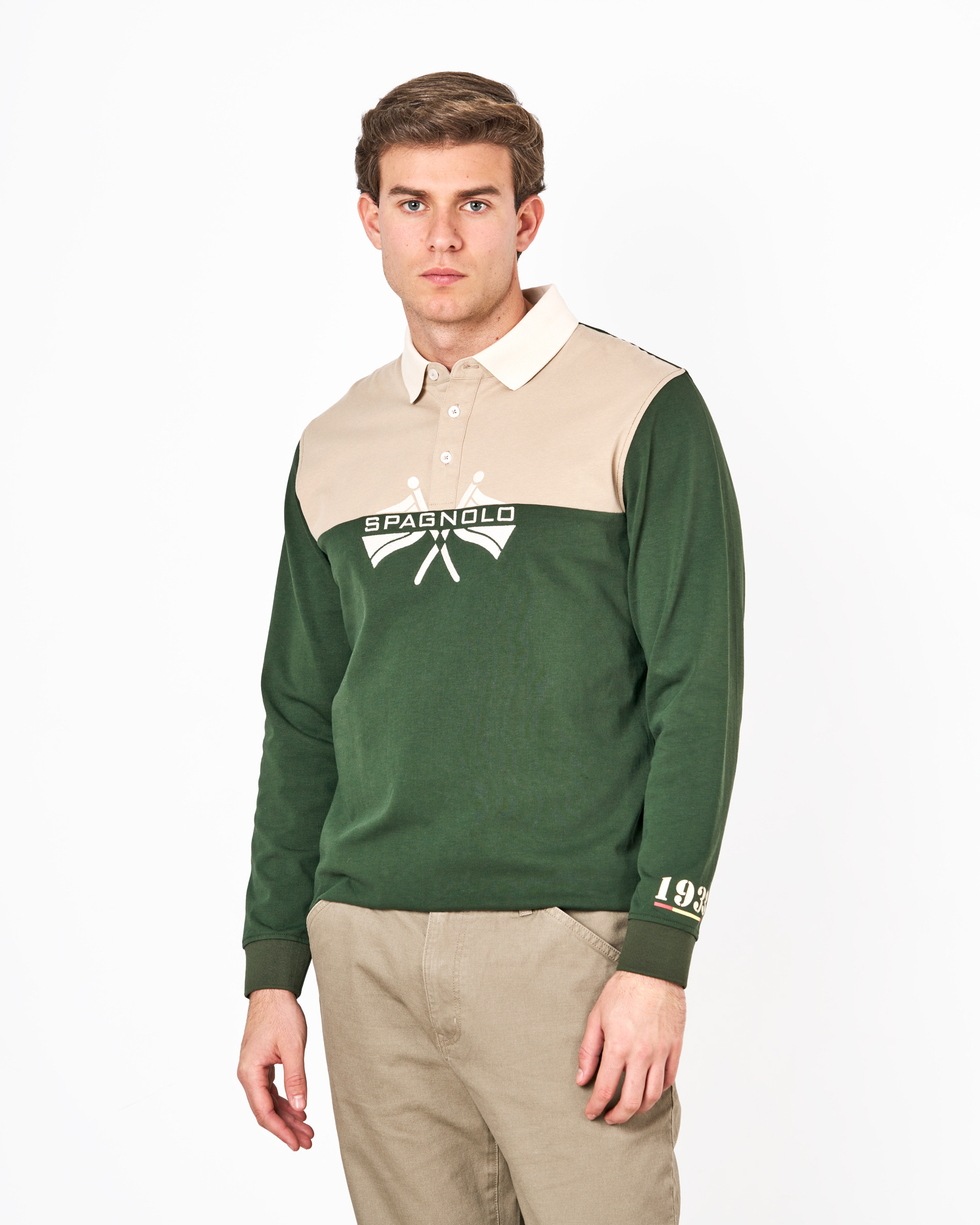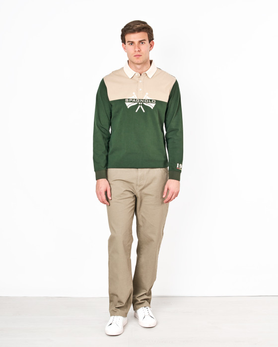Este polo de manga larga es una pieza distintiva con un diseño color block en el pecho. Confeccionado en punto grueso de 100% algodón, ofrece calidez y una comodidad excepcional. El corte bicolor, con el logo y el motivo de banderas estampados a contraste, le da un aire deportivo y de colección. Presenta un cuello de polo clásico con tapeta de botones. Ideal para un look casual y con personalidad.