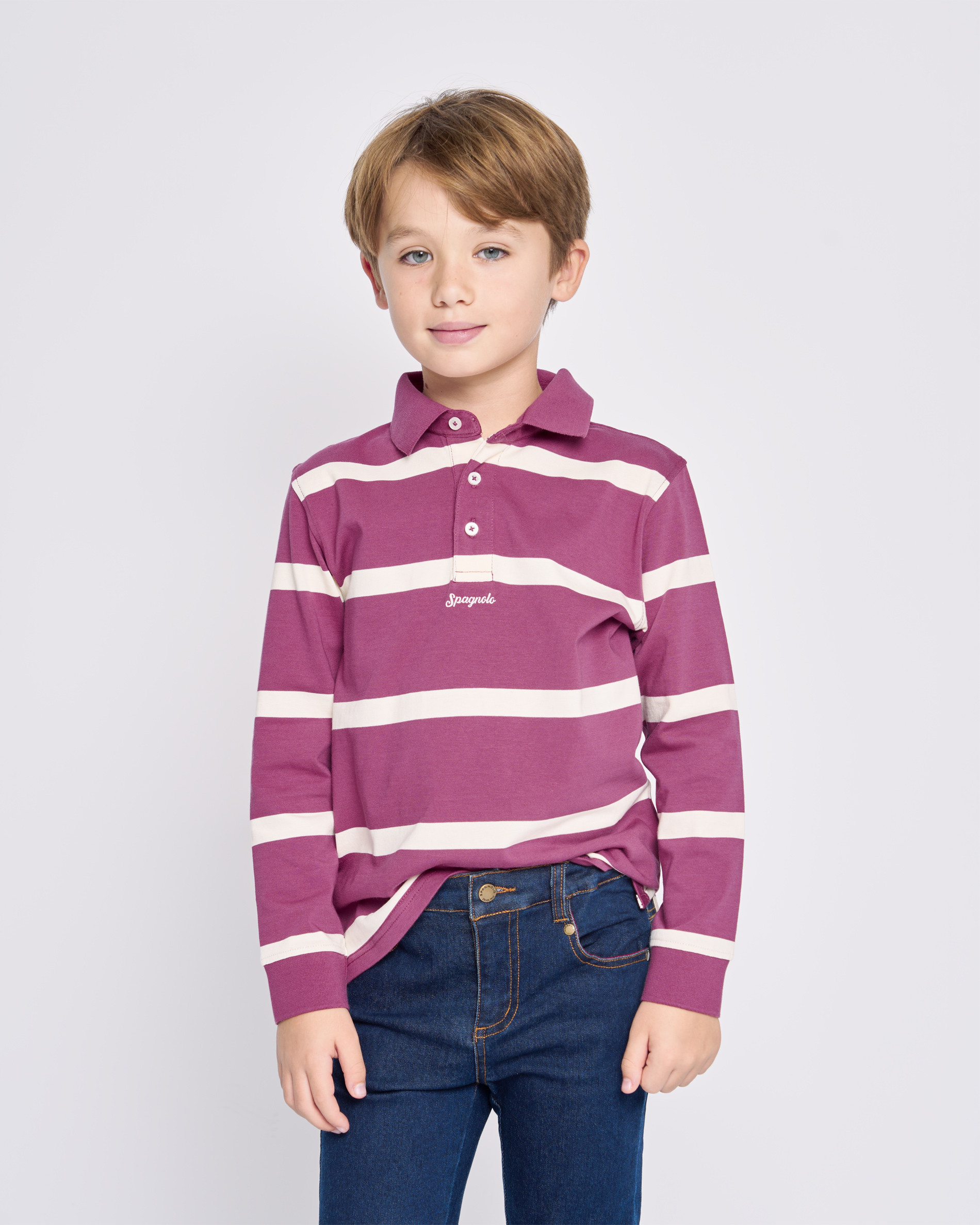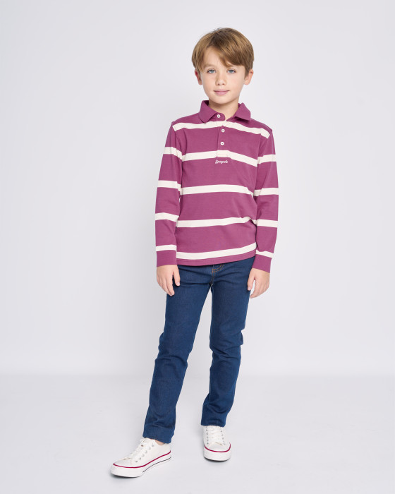 Polo de manga larga de punto grueso ($100\%$ algodón), ideal para el entretiempo. Diseño de rayas horizontales y cuello clásico. Incorpora la bandera española en la tapeta de botones y un bordado de marca. Confortable y con un toque deportivo.