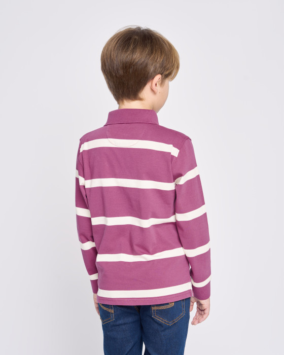 Polo de manga larga de punto grueso ($100\%$ algodón), ideal para el entretiempo. Diseño de rayas horizontales y cuello clásico. Incorpora la bandera española en la tapeta de botones y un bordado de marca. Confortable y con un toque deportivo.
