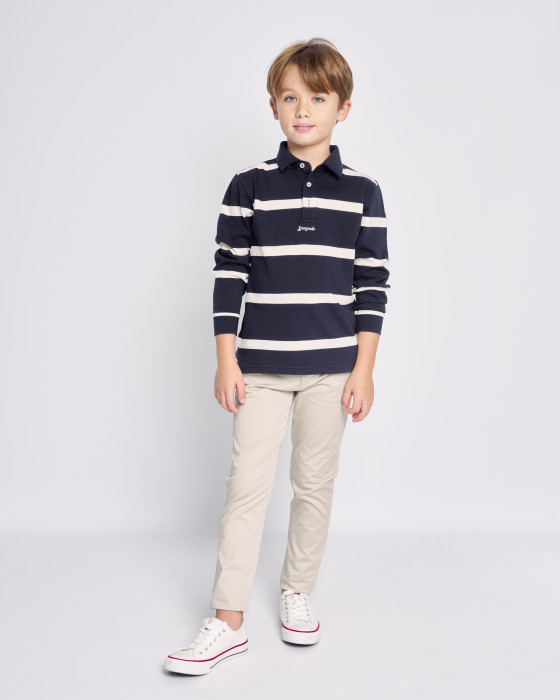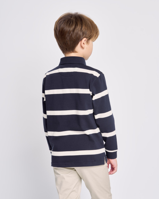 Polo de manga larga de punto grueso ($100\%$ algodón), ideal para el entretiempo. Diseño de rayas horizontales y cuello clásico. Incorpora la bandera española en la tapeta de botones y un bordado de marca. Confortable y con un toque deportivo.