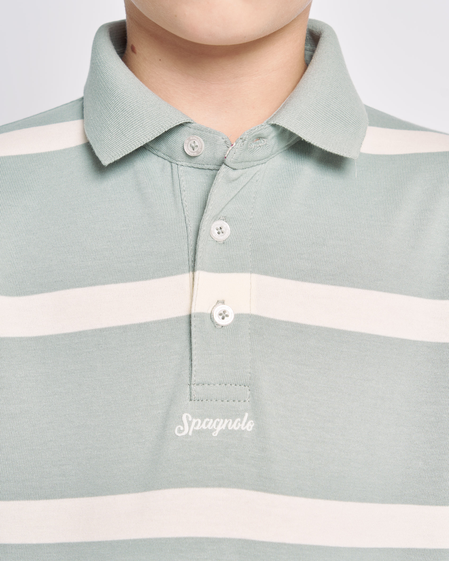 Polo de manga larga de punto grueso ($100\%$ algodón), ideal para el entretiempo. Diseño de rayas horizontales y cuello clásico. Incorpora la bandera española en la tapeta de botones y un bordado de marca. Confortable y con un toque deportivo.