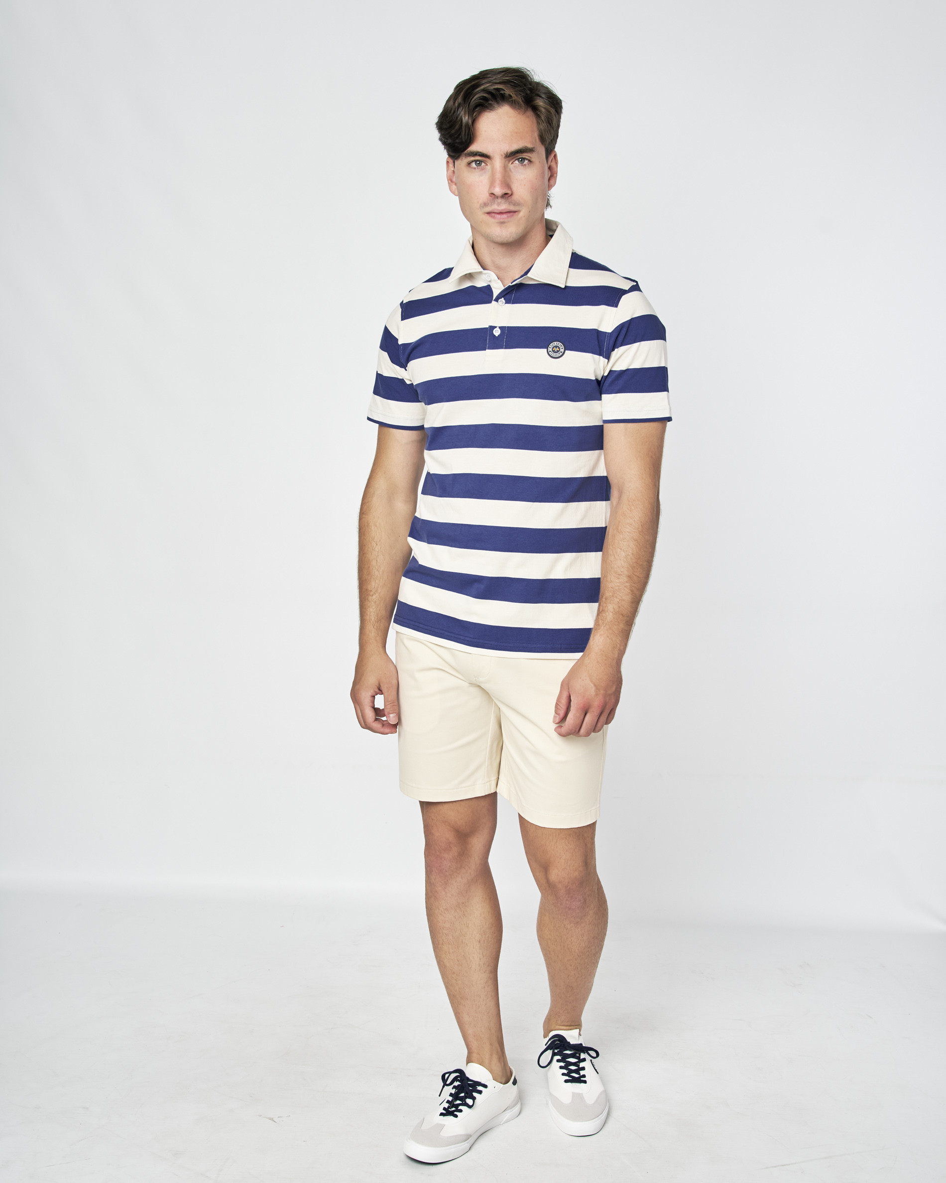 Polo Spagnolo de manga corta con rayas horizontales en azul y blanco.