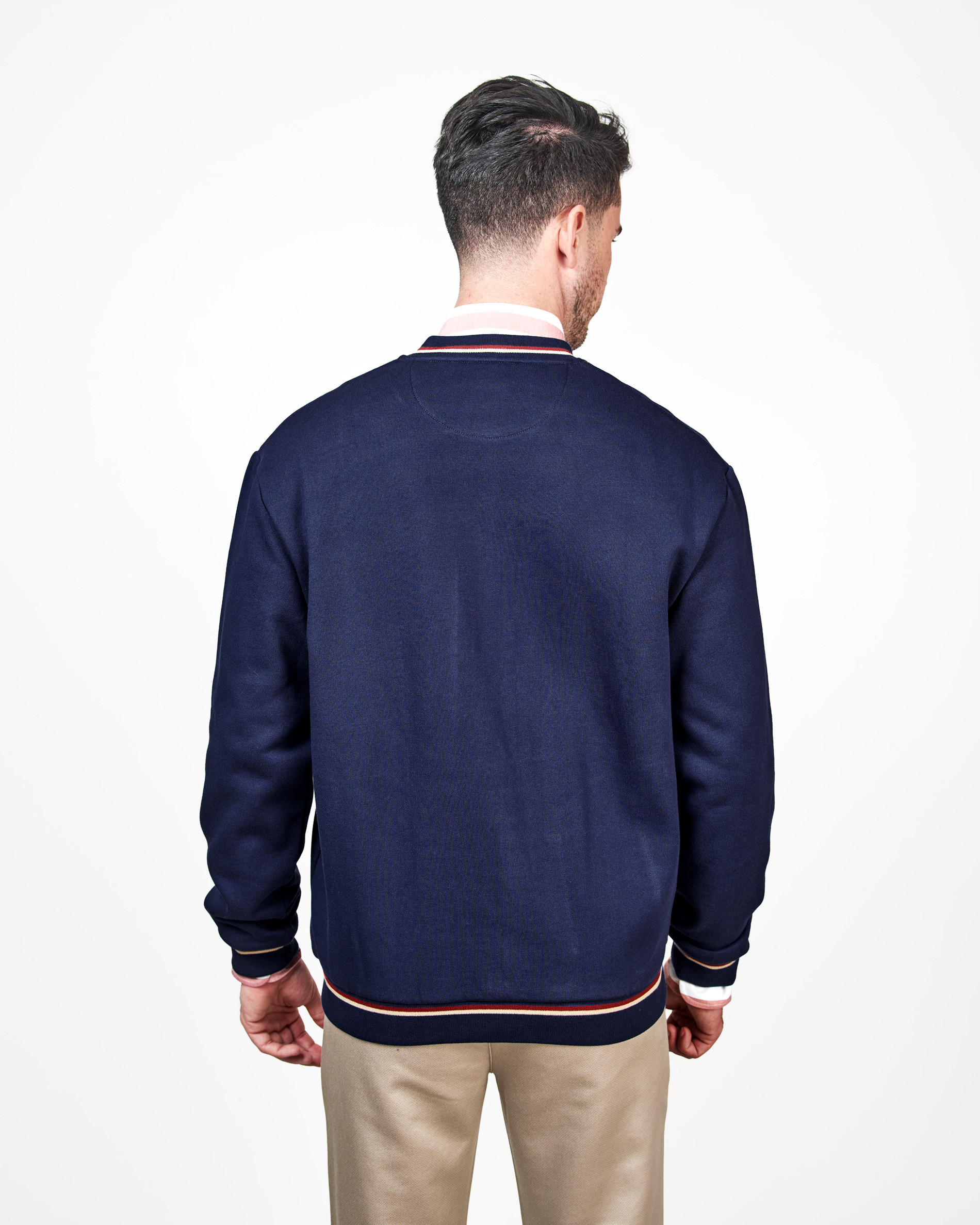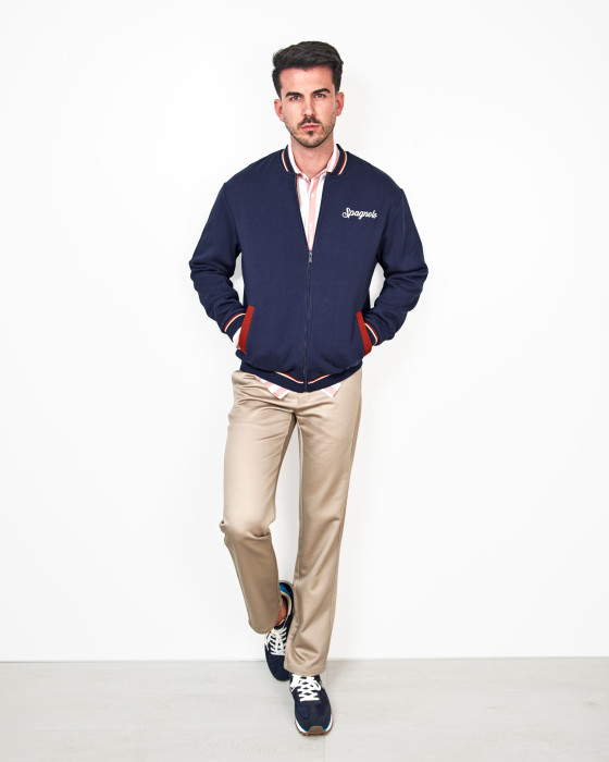 Actualiza tu vestuario de entretiempo con esta chaqueta de punto que combina la comodidad de una sudadera con la estructura de una bomber.Confeccionada en un clásico color azul marino, esta prenda destaca por su cierre de cremallera completa y los ribetes acanalados en el cuello, puños y bajo con detalles a contraste (blanco y terracota/rojo). El diseño se remata con el logo de la marca bordado en
